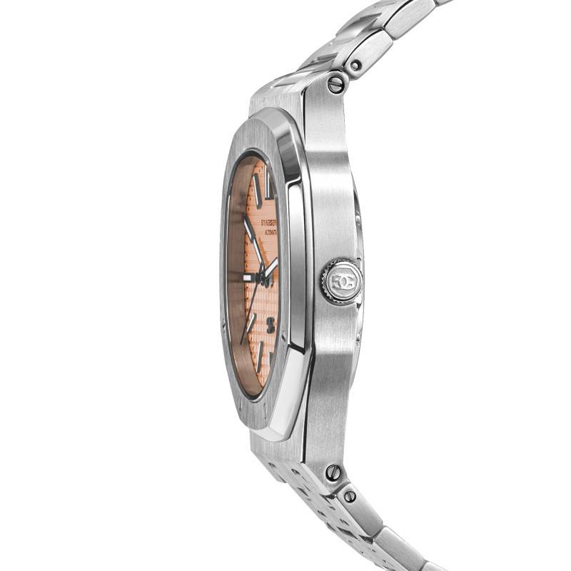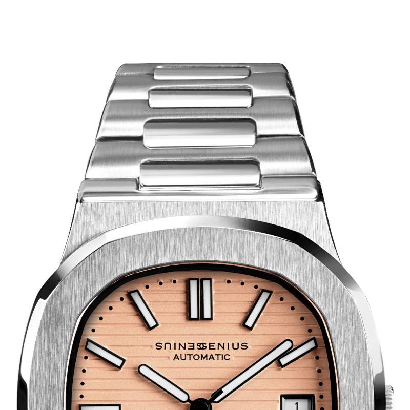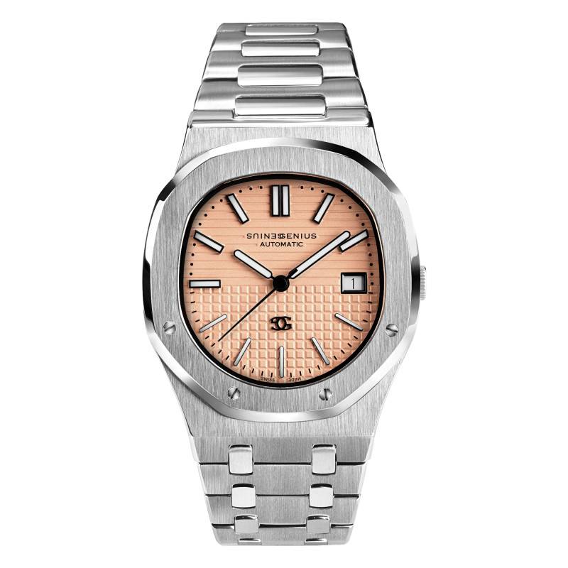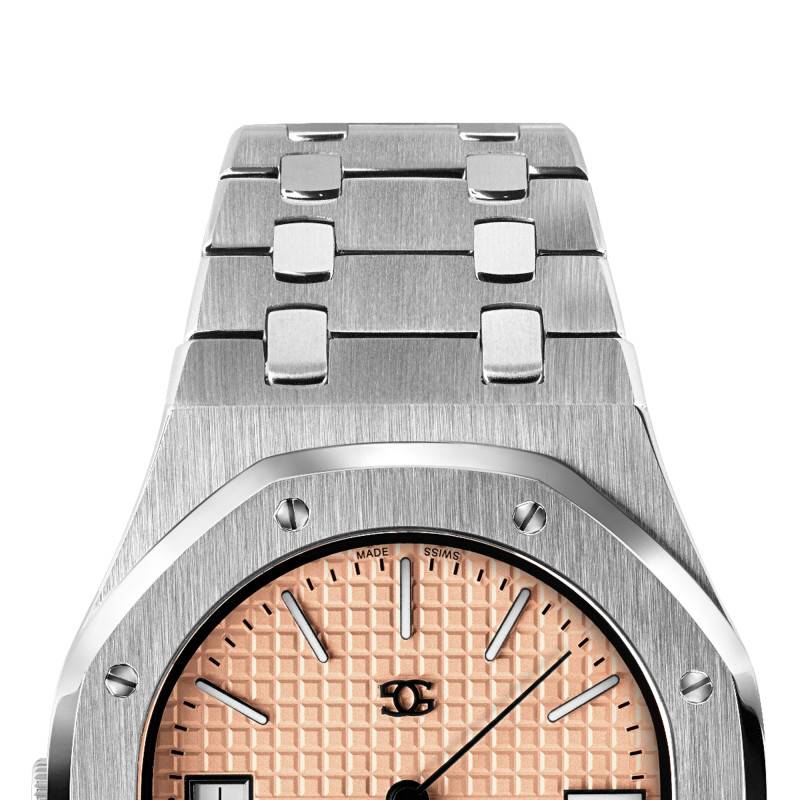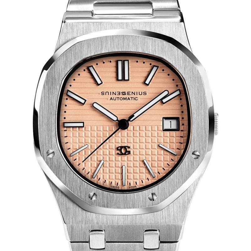 Ce cadran présente une allure soignée qui rehausse ce modèle à merveille. Il est parfaitement disposé afin de vous offrir une lecture du temps nettement précise. Sublimé par un joli fond saumon, il se pare d'une finition à motif carré d'un côté et des lignes striées de l'autre, ce qui lui apporte une touche captivante. Original, il dévoile en bordure le chemin de fer des minutes avec des index bâtons aux formes distinctes marquant les heures. Ensemble, ils seront survolés par les trois aiguilles grises fixées au centre. Ces dernières se composent d'une grande et d'une courte aiguille indiquant respectivement les minutes et les heures ainsi que d'une fine trotteuse totalisant les secondes. Un guichet date les rejoint à 3 heures pour plus de fonctionnalité. Enfin, la marque appose son nom et le type de mouvement sous le double index de 12 heures et mentionne à l'opposé le logo et la mention Swiss Made en guise de signature.