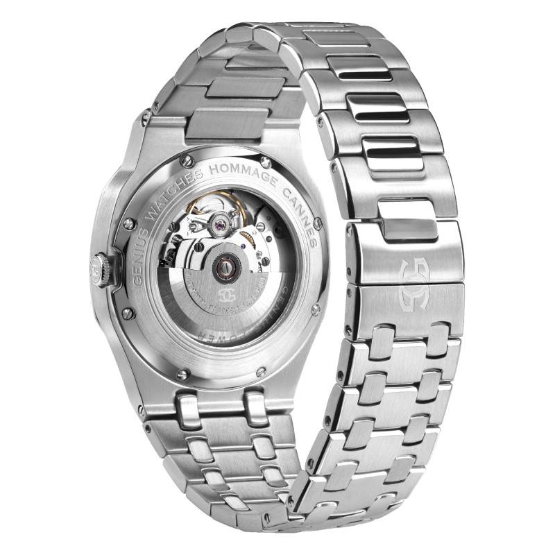 La marque Genius créé des garde-temps parfaitement équipés pour les amateurs horlogers. Elle arbore des modèles aux designs créatifs qui se démarquent par leur fiabilité et leurs mécanismes fiables. Forte d'un savoir-faire horloger, exceptionnel, elle confectionne des montres résistantes et précises qui sauront surmonter toutes les situations. Elles sont dotées de nouvelles technologies et vous accompagneront lors de vos plus grandes aventures. Ayant toujours les mêmes ambitions, elle vous propose à travers sa collection Hommage cette montre Cannes qui parera à merveille les poignets masculins. Elle se pare d'un boîtier tonneau arborant des vis sur la partie inférieure mesurant 49,80 mm de longueur, 39 mm de largeur pour une épaisseur de 10,60 mm. De couleur grise, ce dernier est fabriqué en acier inoxydable 316L brossé et poli donnant cette allure soignée. Il dévoile un cadran surmonté et protégé par un résistant verre saphir antireflet. Grâce à ce revêtement, ce dernier vous offrira une lisibilité sans contrainte. À trois heures, une couronne argentée et crantée vous facilitera la prise en main. Elle est munie d'un double joint torique et elle manipule les différents éléments centraux. Enfin, ce garde-temps se ferme par un fond de boîte maintenu par des vis et assurant une étanchéité de 5 ATM. Grâce à son ouverture, il vous permet d'admirer les rouages du mouvement. Veuillez noter qu'il est possible d'accompagner votre montre avec un remontoir grâce au menu déroulant.