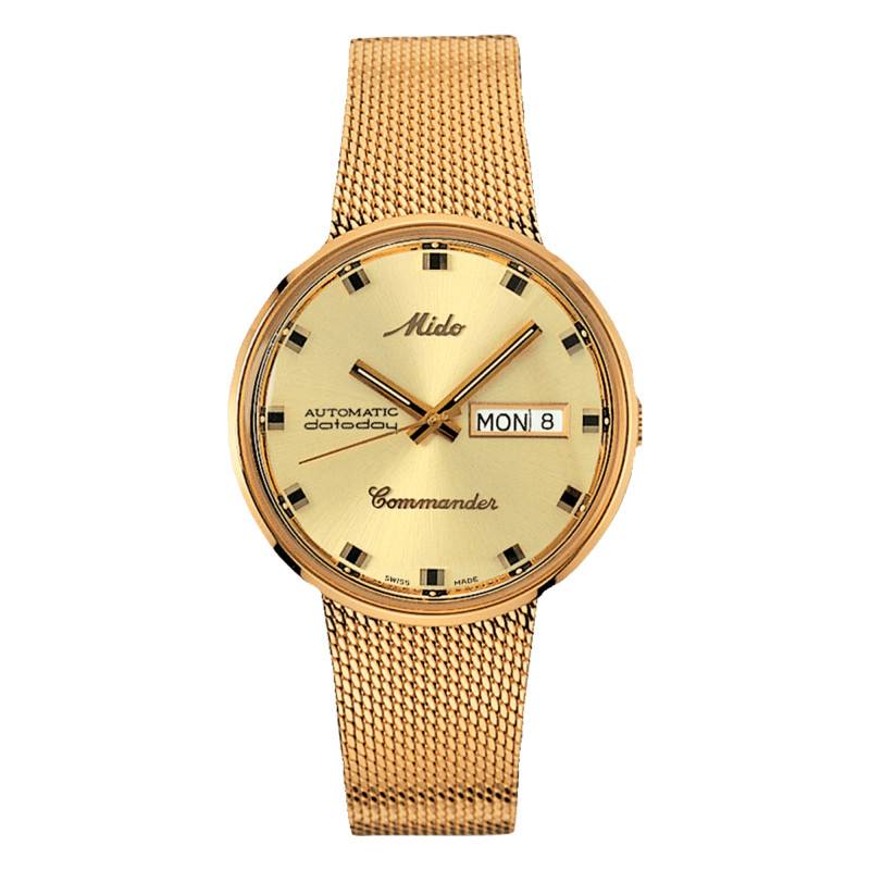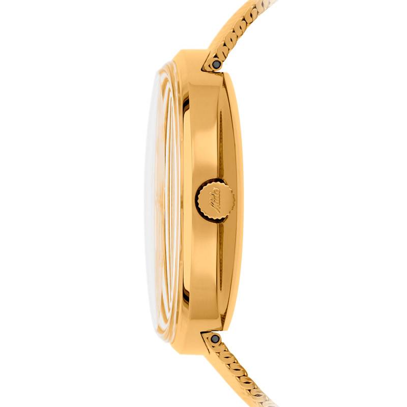 Fondée en 1918, Mido est rapidement devenue une référence dans l'univers de l'horlogerie. La marque se distingue par sa maîtrise de l'alliance entre l'héritage horloger suisse et des designs modernes et innovants. En alliant mécanismes automatiques de haute précision et matériaux de qualité, Mido conçoit des montres alliant à la fois performance et raffinement. Aujourd'hui, la marque est fière de vous présenter la montre 195M842932213 provenant de la collection Commander. Son boîtier en acier inoxydable poli est revêtu d'un traitement PVD gold. De forme ronde, il mesure 37 mm de largeur et de longueur, 10,50 mm d'épaisseur, correspondant ainsi aux poignets des femmes et des hommes. Avec un poids de 85 gr, ce boîtier de couleur dorée combine robustesse et confort au quotidien. Un verre acrylique plat le surplombe pour permettre une bonne visibilité du cadran. Par ailleurs, la couronne crantée placée à 3 heures affiche le nom de la marque et permet de régler les aiguilles et le guichet. Pour finir, le fond emboîté de ce garde-temps assure une solidité maximale et garantit une étanchéité de 5 ATM.