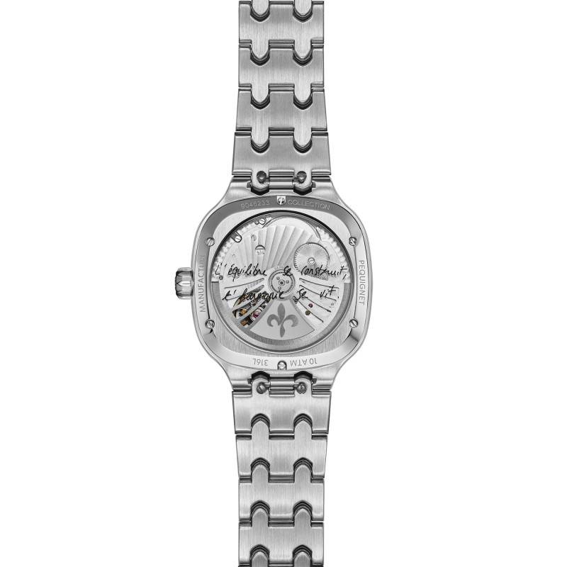 Avec un boîtier carré de 36 mm de diamètre et une épaisseur de 9,25 mm, sa silhouette se distingue par sa modernité et son élégance discrète. Fabriquée en acier inoxydable 316L, la montre offre une finition mate brossée/satinée, apportant une touche sophistiquée et une résistance accrue face aux aléas du quotidien. Le fond transparent, maintenu par des vis et protégé par un verre saphir, permet d'admirer le mouvement complexe du garde-temps.