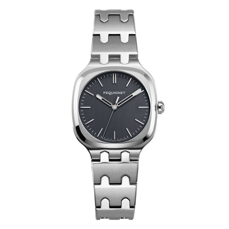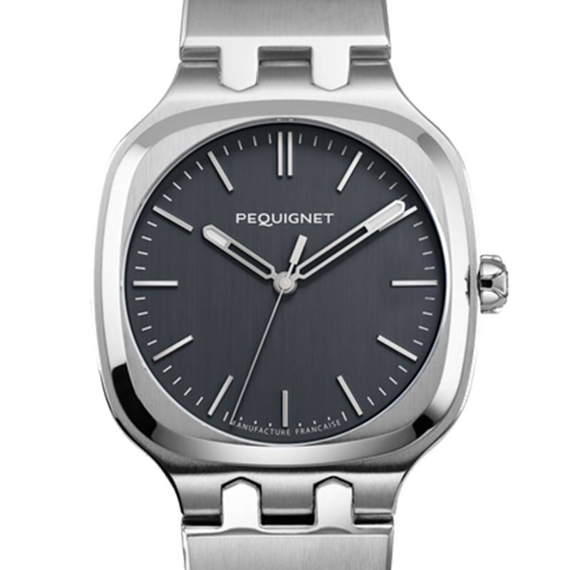 Le cadran de cette montre est d'un gris anthracite profond, offrant une finition matte qui accentue la lisibilité et la sophistication du design. Les index fins sont complétés par un chemin de fer des minutes, tandis que les aiguilles traitées au SuperLuminova assurent une visibilité optimale même en faible lumière. L'affichage analogique comprend les heures, les minutes et les secondes, soulignant la simplicité et l'efficacité suisse de Pequignet. Le verre saphir plat couvre cet ensemble, protégeant le cadran des rayures et des impacts.