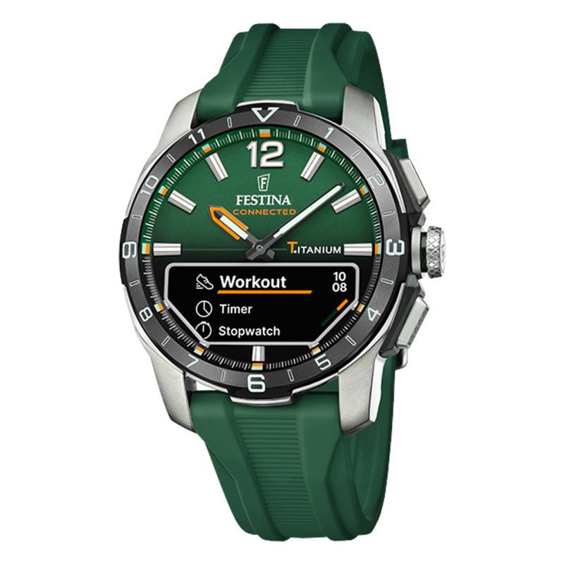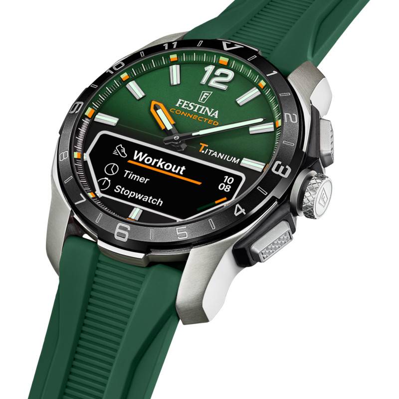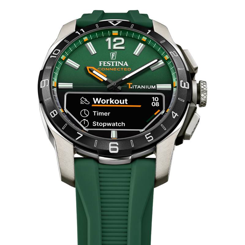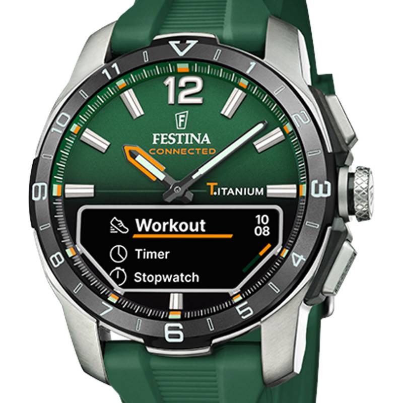 Bien agencé et soigné, le cadran affiche une élégance intemporelle et une beauté sophistiquée. Il possède une base de couleur verte très belle à regarder avec des index bâtons argentés occupant la partie supérieure du cadran. Ils sont traités de luminescence tout comme les aiguilles afin de garantir une meilleure lisibilité dans les endroits obscurs. L'aiguille des heures se trouve mise en avant par une couleur orange faisant écho aux petits index barres marqués sur le rehaut et associés à un chemin de fer des minutes détaillé. Sur la partie inférieure du cadran, se trouve l'afficheur digital Oled qui indique plusieurs fonctionnalités. Enfin, Festina appose sa signature sous l'index de 12h représenté par un chiffre arabe.