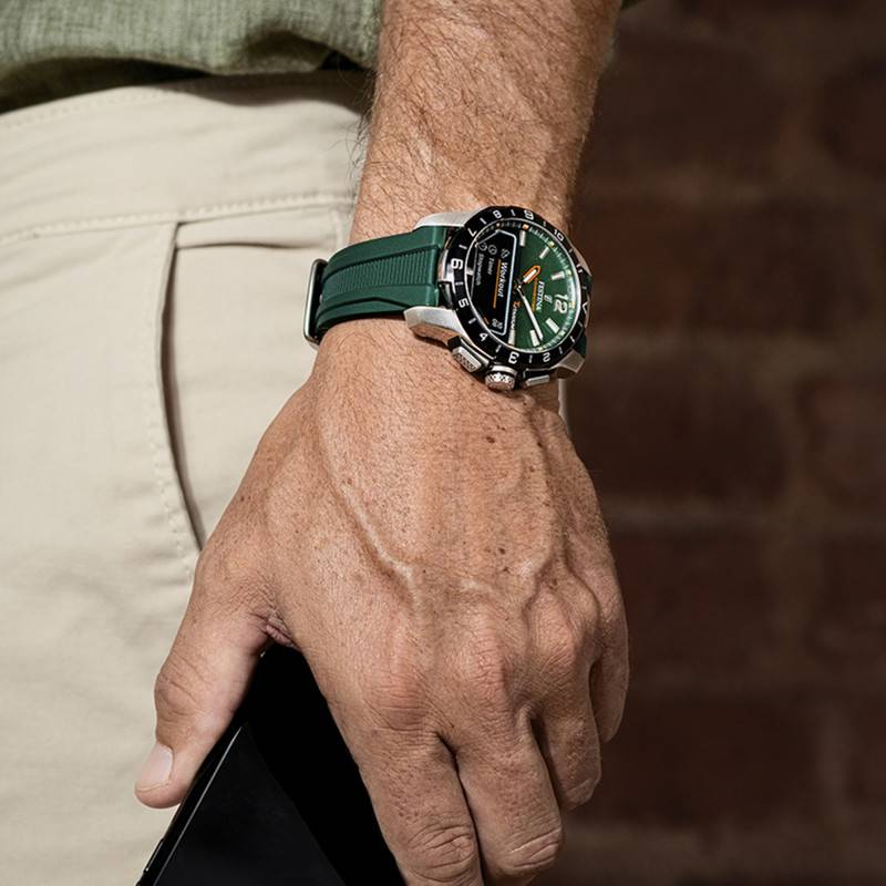 Cette montre se pare d'un bracelet en silicone, dont la couleur verte est en parfaite harmonie avec celle du cadran. Il présente une finition texturée qui lui donne une allure à la fois robuste et décorative. Doté d'une boucle ardillon, il est confortable, souple et facile à porter.