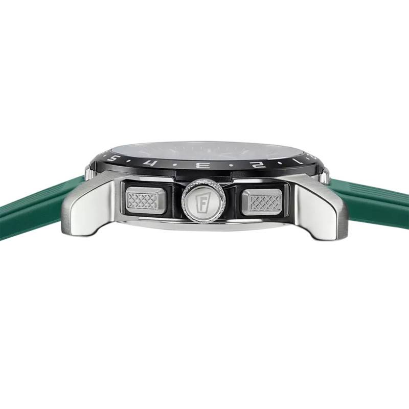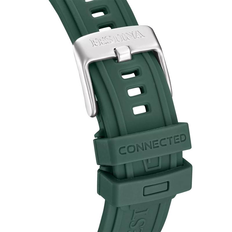 Le bracelet en caoutchouc de la Festina Connected Full D se révèle être à la fois fonctionnel et esthétiquement plaisant. D'une couleur vert dynamique, il s'associe parfaitement au reste de la montre, offrant une continuité visuelle attrayante. Avec une largeur d'entrecorne de 23 mm, il s'ajuste parfaitement au poignet, assurant un maintien à la fois ferme et confortable grâce à sa boucle ardillon classique.
