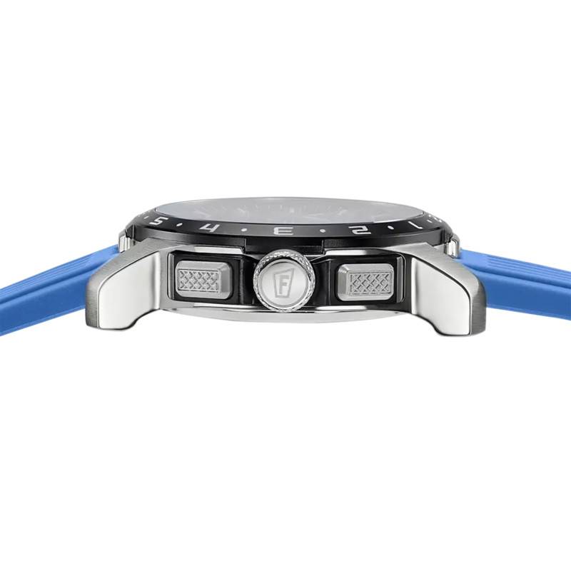 Le bracelet en caoutchouc de couleur bleue est parfait pour un usage quotidien, conjuguant résistance et confort. Sa texture douce et flexible enveloppe le poignet avec aisance, assurant un maintien agréable. Le système de fermeture par boucle ardillon garantit simplicité et sécurité, facilitant le port de la montre en toute circonstance. La largeur du bracelet, mesurant 23 mm à l'entrecorne, est équilibrée pour compléter l'imposant boîtier, harmonisant ainsi la structure globale de la montre.