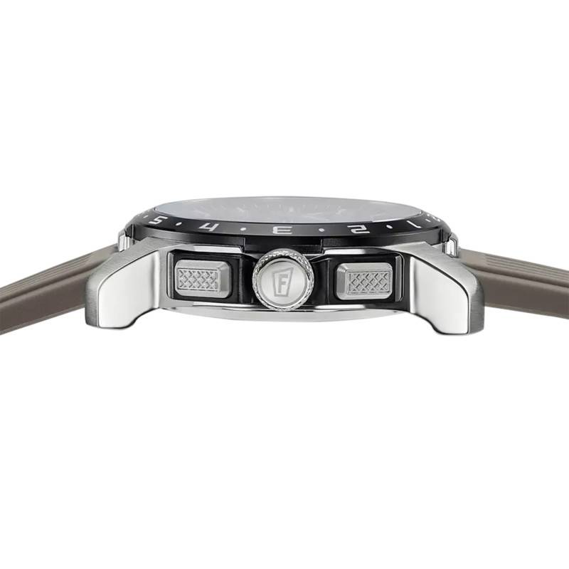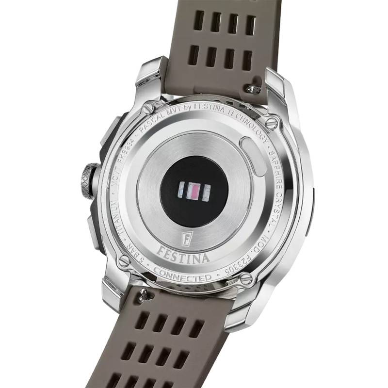 La montre Festina Connected Full D incarne un sommet technologique dans le monde de l'horlogerie moderne. Avec son boîtier en titane au design rond, elle s'étend sur un diamètre impressionnant de 44 mm pour une épaisseur de 14 mm, garantissant une présence affirmée au poignet. Le choix du titane assure non seulement légèreté mais également robustesse inégalée, apte à affronter les défis quotidiens. Le fond du boîtier, maintenu par des vis, assure une solidité accrue et une protection optimale des mécanismes internes. La montre s'orne d'un verre saphir plat, réputé pour sa résistance ultime aux rayures, offrant ainsi une vue dégagée et limpide sur le cadran.