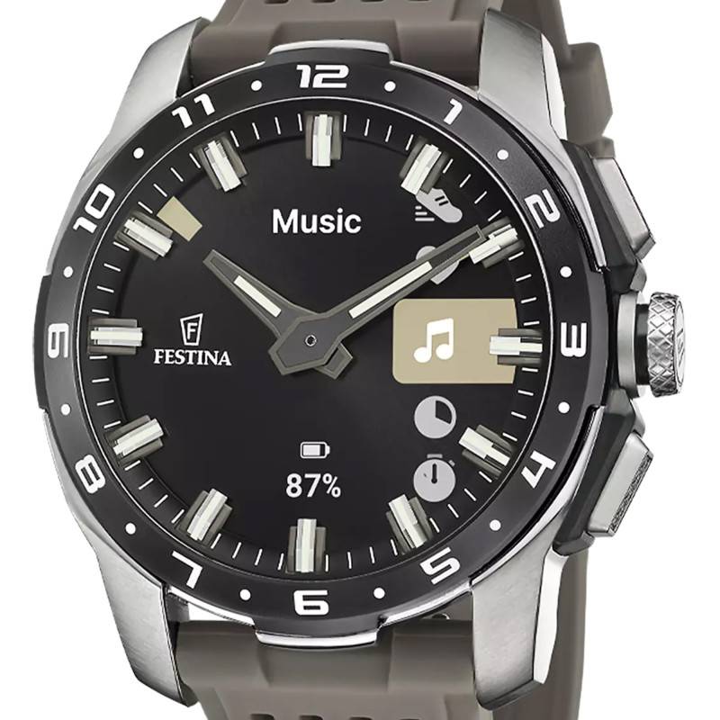 Le cadran de la Festina Connected Full D se dote d'une allure à la fois sobre et sophistiquée, revêtu d'un noir profond qui constitue le parfait arrière-plan pour ses index et son chemin de fer des minutes. Les fonctions chronométriques s'affichent avec une clarté exemplaire grâce à un agencement judicieusement pensé. Des indicateurs tels que le contrôle de la musique et le niveau de la batterie trouvent place harmonieusement, enrichissant l'expérience utilisateur. Les marquages du temps - heures, minutes, jours, et mois - ressortent distinctement, facilitant une lecture rapide et intuitive, essentielle aux exigences d'un mode de vie dynamique.