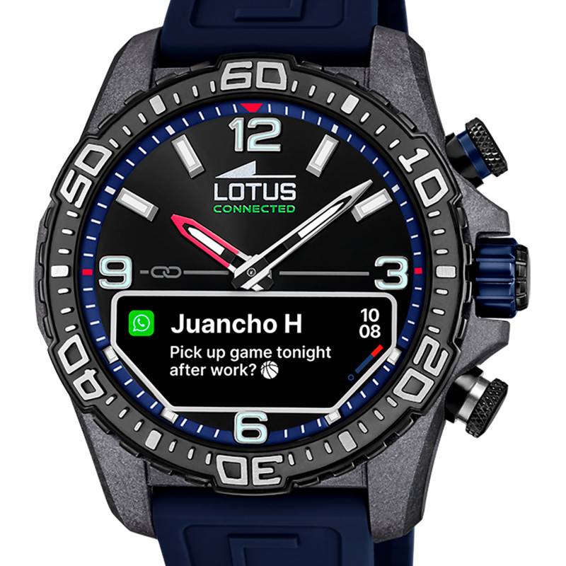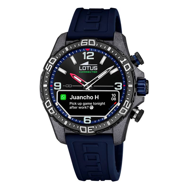La marque espagnole Lotus ne cesse de repousser ses limites en matière d'horlogerie en proposant des garde-temps robustes et fiables. Ses modèles sont imaginés et réalisés avec minutie par des experts horlogers expérimentés. Ils sont formés à partir de matériaux solides et des mécanismes de pointe avec des designs audacieux qui vous accorderont du style en toute occasion. Aujourd'hui, la marque horlogère propose la montre connectée 20000/4 qui ornera les poignets des hommes avec splendeur. Elle se pare d'un boîtier en fibre de carbone affichant 45 mm de diamètre et 14,60 mm d'épaisseur. Imposant, il est muni d'une lunette noire comportant une échelle des minutes et des chiffres arabes séparés de 10 en 10. Il dévoile sur la droite une couronne rouge et crantée assurant une bonne prise en main. Elle est accompagnée de deux boutons-poussoir et ils manipulent ensemble les éléments centraux. Ces derniers sont surmontés par un verre saphir qui les protège des chocs potentiels. Cette montre est pourvue d'une étanchéité de 3 ATM assurée par son fond de boîte à capteurs biométriques qui est maintenu par des vis.