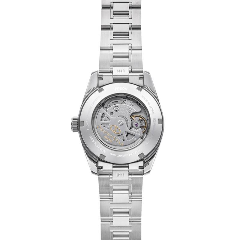 La montre Contemporary date RE-AU0112V de la marque Orient Star se distingue par son design élégant et ses matériaux robustes. Le boîtier en acier inoxydable de forme ronde mesure 38,50 mm de diamètre et 12,30 mm d'épaisseur, assurant un port confortable tout en étant résistant. Ce modèle arbore une finition brossée/satinée qui lui confère un aspect moderne et sophistiqué. Avec sa lunette également en acier, cette montre est conçue pour capturer l'intérêt des connaisseurs de l'horlogerie. Le verre est un verre saphir plat, bénéficiant d’un traitement antireflets, garantissant une résistance exceptionnelle aux rayures tout en offrant une lisibilité optimale sous toutes les conditions d’éclairage. Le fond est transparent et vissé, une caractéristique qui ajoute une touche raffinée tout en permettant d'admirer le mécanisme interne.
