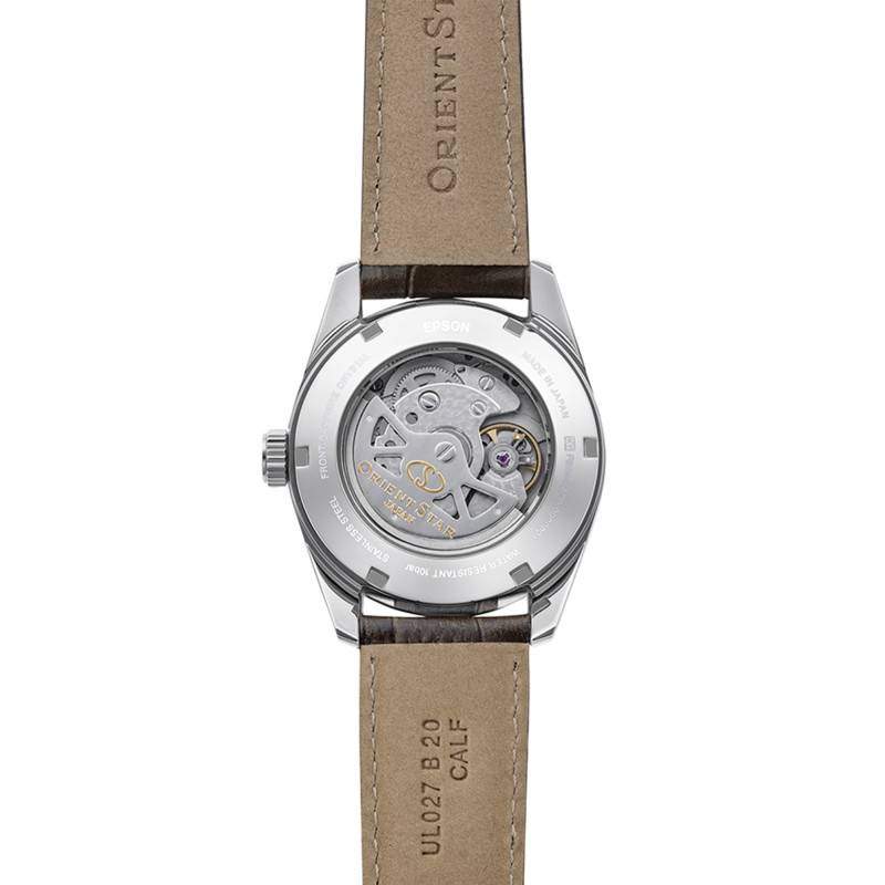 La montre Orient Star est un modèle raffiné et moderne, conçu pour répondre aux attentes des hommes élégants. Le boîtier en acier inoxydable offre une robustesse et une durabilité exceptionnelles. Sa forme ronde et ses dimensions judicieusement étudiées (diamètre de 38,50 mm et épaisseur de 12,30 mm) s’adaptent parfaitement à un usage quotidien ou à des occasions spéciales. La finition mate (brossée/satinée) confère à l’ensemble un aspect sophistiqué, accentué par une lunette en acier qui assure une transition harmonieuse vers le cadran. Grâce au verre saphir plat et à son traitement antireflets, la lisibilité est optimale, évitant les reflets indésirables.