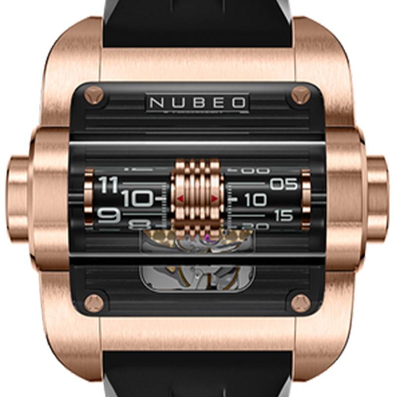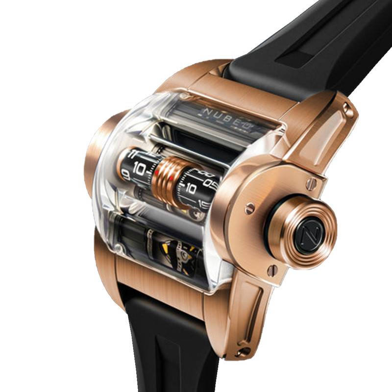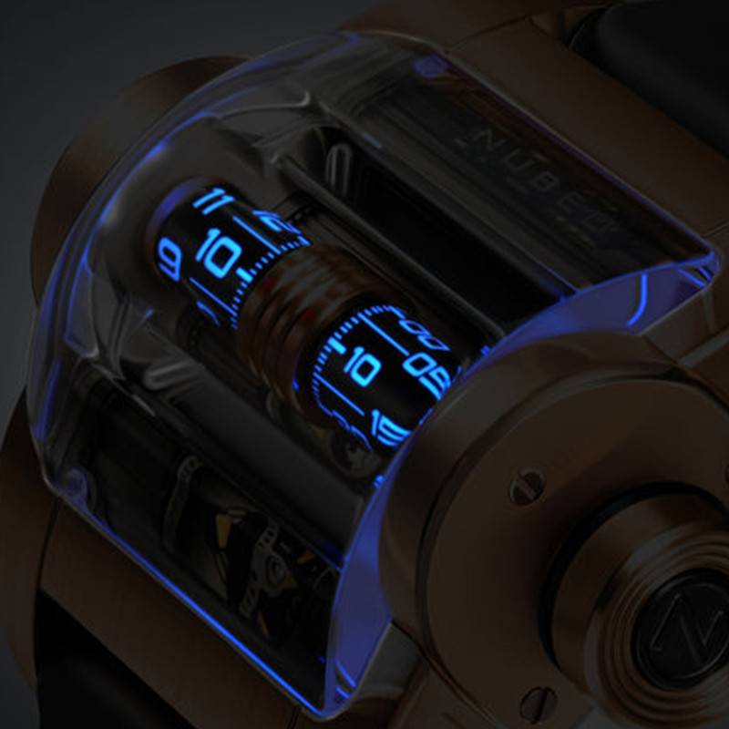 Le cadran de la Nubeo Continuum Automatic est un chef-d'œuvre de design et d'ingénierie. Avec sa finition à cœur ouvert, le cadran offre une vue fascinante sur le mouvement interne de la montre. Les chiffres luminescents sont visibles à travers le cylindre rotatif et permettent une lecture facile dans l'obscurité, renforçant à la fois l'aspect pratique et esthétique du garde-temps. L'ensemble est protégé par un verre minéral bombé, traité pour éviter les reflets indésirables.