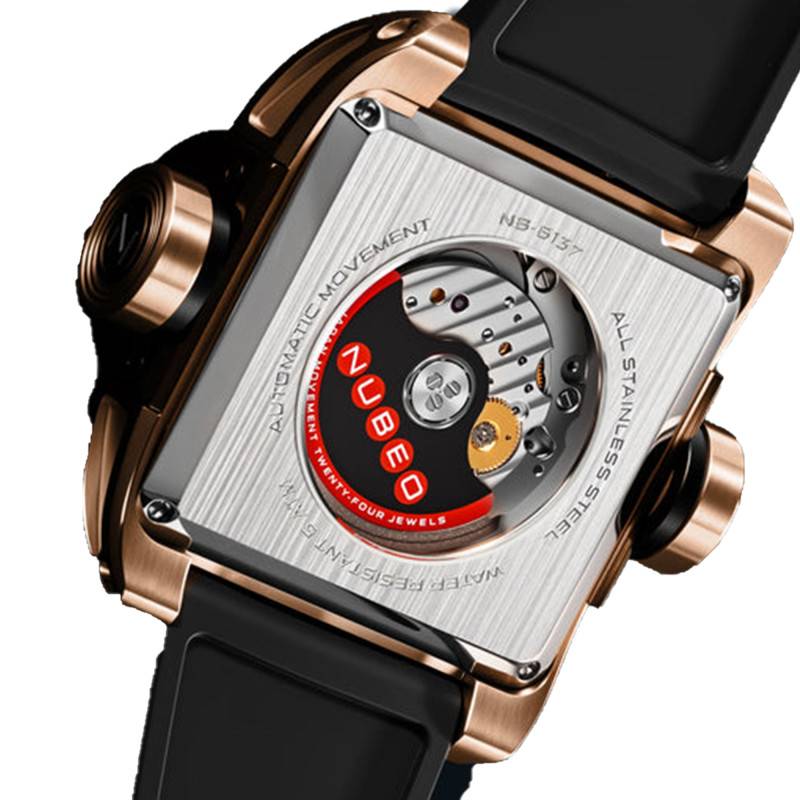 La montre Nubeo Continuum se distingue par son design à la fois robuste et sophistiqué. Le boîtier de forme rectangulaire est réalisé en acier inoxydable, garantissant une longue durée de vie tout en apportant une touche moderne et élégante. Avec ses dimensions importantes, un diamètre de 43,50 mm et une épaisseur de 21 mm, cette montre affiche une présence imposante au poignet. Le poids de 130 g souligne son caractère massif et résistant. La lunette, également en acier inoxydable, entoure un verre bombé en verre minéral, traité anti-reflets pour une visibilité optimale quelles que soient les conditions lumineuses.