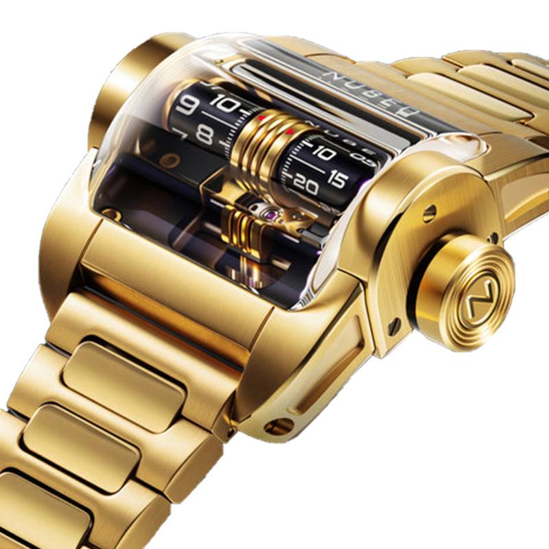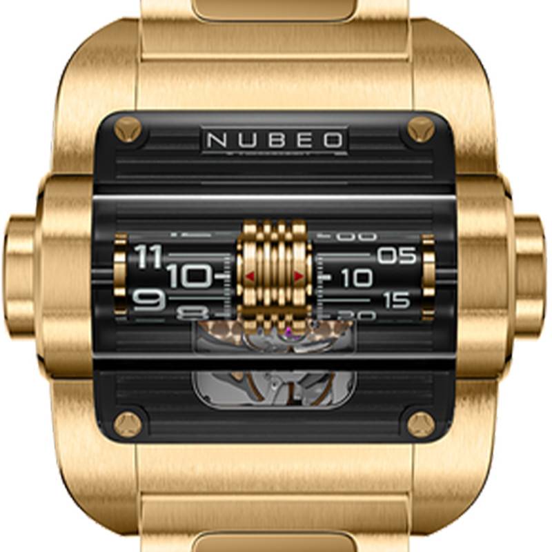 Le bracelet de ce modèle Nubeo est une œuvre d'art à lui seul, témoignant d'un soin particulier apporté à chaque détail pour prolonger la sophistication du boîtier. Confectionné en acier de haute qualité, il présente une surface où brossage et polissage s'allient pour former un rendu jaune éclatant, synonyme de prestige et d'élégance. Avec un entrecorne de 26 mm, ce bracelet se fixe fermement au poignet à l'aide d'une boucle déployante, une caractéristique essentielle pour ceux qui recherchent à la fois flexibilité et sécurité.