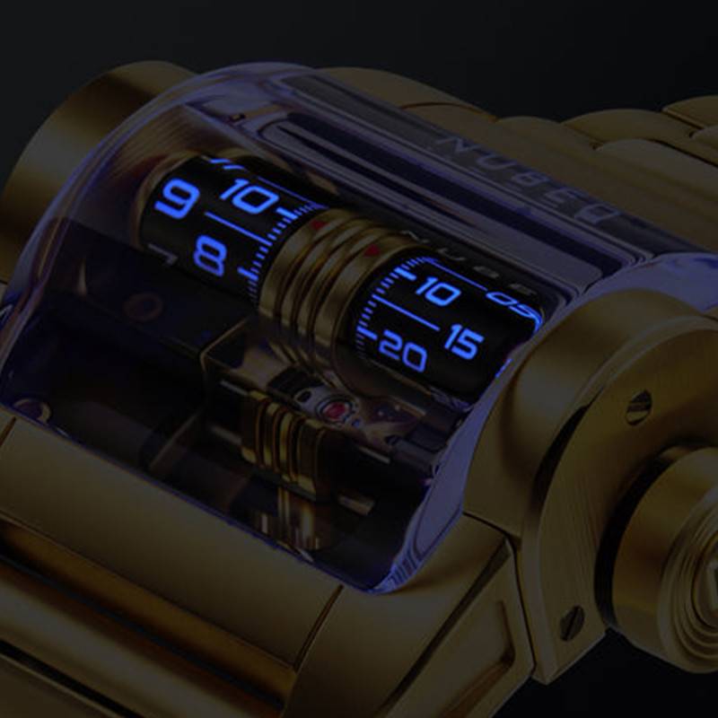 Sublime et intrigant, le cadran de la Nubeo Continuum Automatic est un véritable hommage à l'ingéniosité horlogère. Ce cadran à cœur ouvert offre une vue fascinante sur le mécanisme intérieur, permettant d'admirer la précision et la complexité des composants en mouvement. Décoré de chiffres luminescents sur un cylindre rotatif, il assure une lisibilité parfaite même dans des conditions de faible luminosité. La combinaison de couleurs où le noir contraste avec le jaune rehausse l'élégance et l'audace de ce modèle. Le jeu de lumière sur la finition brossée du cadran apporte une profondeur et une richesse visuelle incontestables, faisant toute la différence en termes de design.