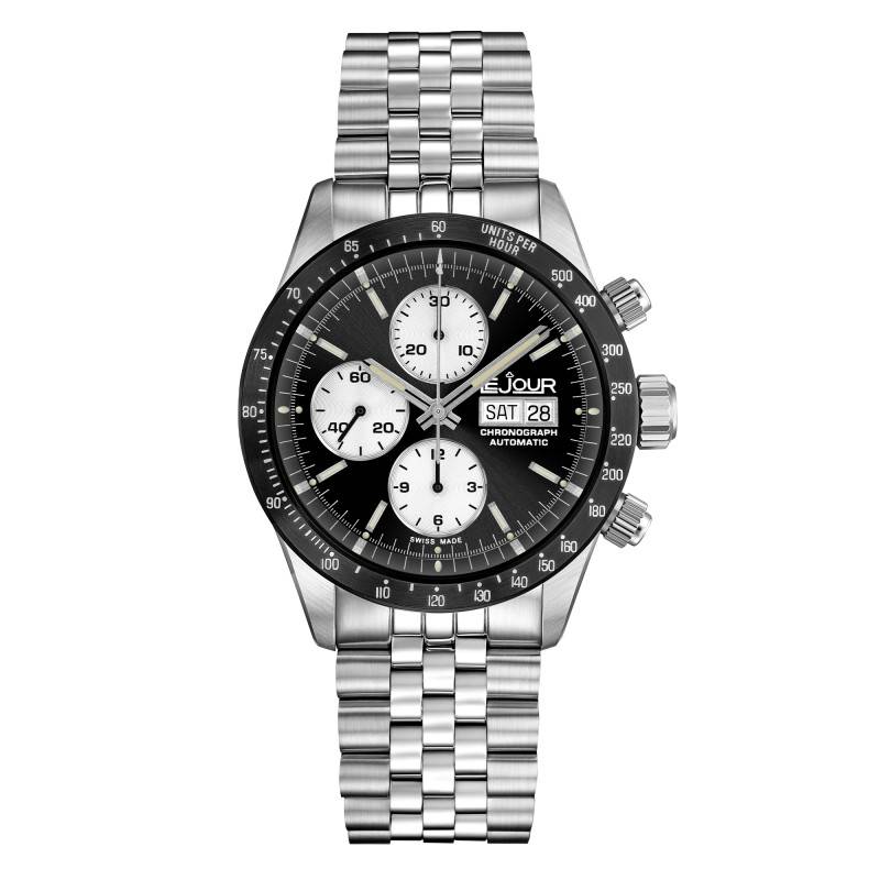 Le cadran noir de la montre, avec sa finition brossée, dégage une élégance sobre mais affirmée. Orné de trois compteurs encastrés aux motifs CD en blanc, il accorde à l'ensemble un contraste visuel sophistiqué. Les aiguilles et index sont revêtus de SuperLuminova C3, garantissant une lisibilité exceptionnelle en toute circonstance. Le guichet date et jour, positionné à 3 heures, se fond harmonieusement dans l'ensemble. Le tachymètre en chiffres arabes sur l'anneau interne assure une fonctionnalité optimale tout en ajoutant une touche sportive à ce garde-temps.