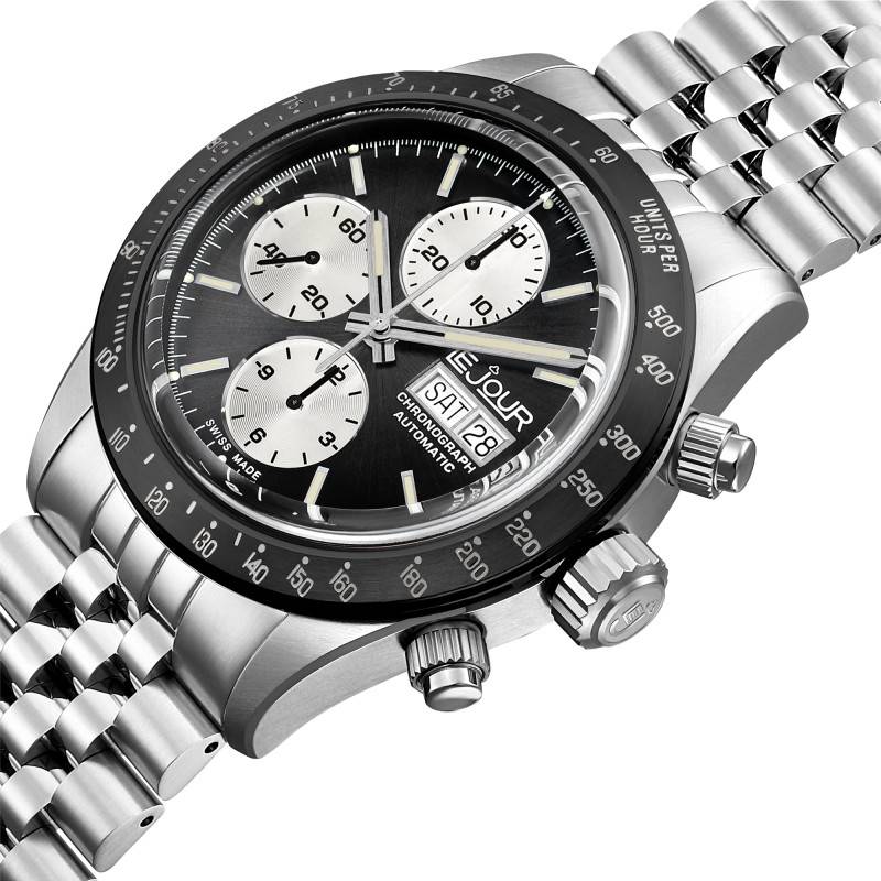 La montre Corsa Master Chrono de Le Jour est une pièce horlogère remarquable qui allie tradition et modernité. Arborant un boîtier en acier inoxydable 316L de 42 mm avec une épaisseur de 17 mm, cette montre offre un mélange séduisant de finitions satinées brossées et de bords chanfreinés polis brillants. Son design évoque un charme rétro tout en restant résolument contemporain. Le verre saphir bombé, traité antireflets, sublime l'esthétique classique de cette création prestigieuse. Élégante et sophistiquée, elle est pensée pour les passionnés de rallye et les adeptes de montres de caractère.