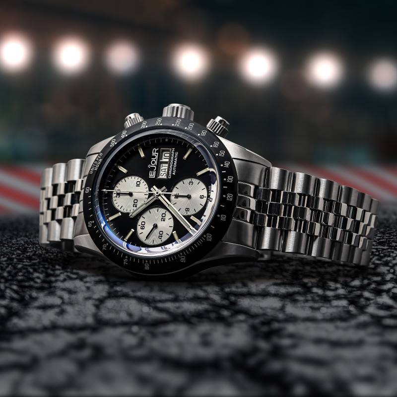 Ce garde-temps est animé par le mouvement chronographe automatique suisse Sellita SW500, reconnu pour sa fiabilité et sa précision. Fonctionnant à une fréquence de 28,800 A/h, ce calibre offre une réserve de marche de 62 heures. Il inclut un affichage des heures, minutes, secondes ainsi qu'une fonction chronographe avec des compteurs de 12 heures, 30 minutes et 60 secondes. Le fond de boîte transparent révèle la beauté mécanique interne, magnifiée par le motif de drapeau à damier, soulignant l'expertise horlogère de cette montre.