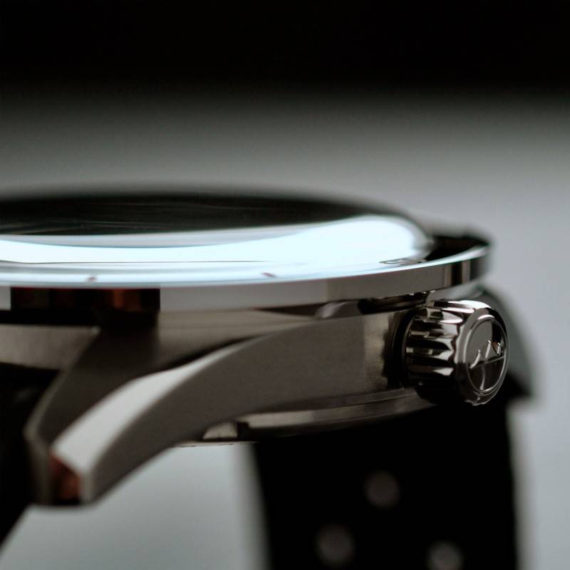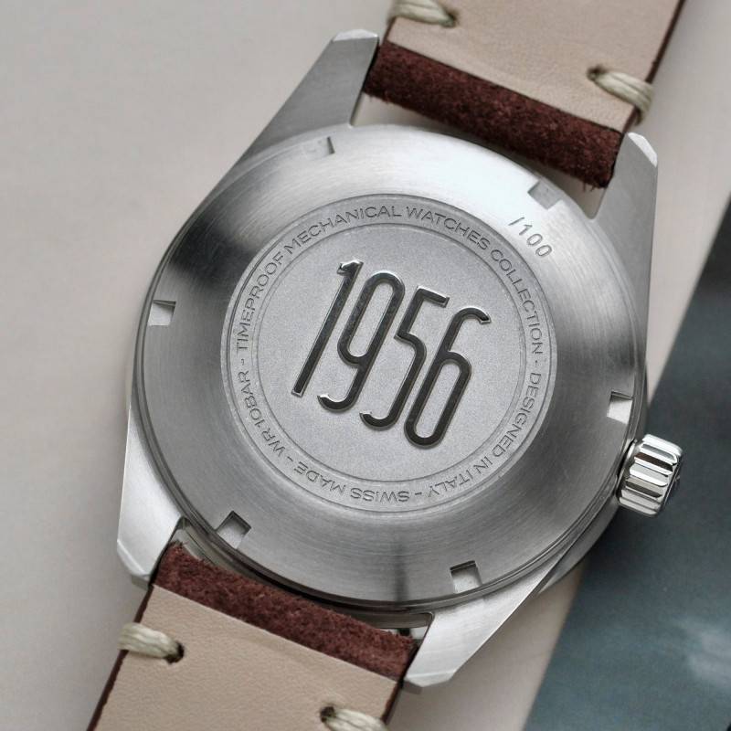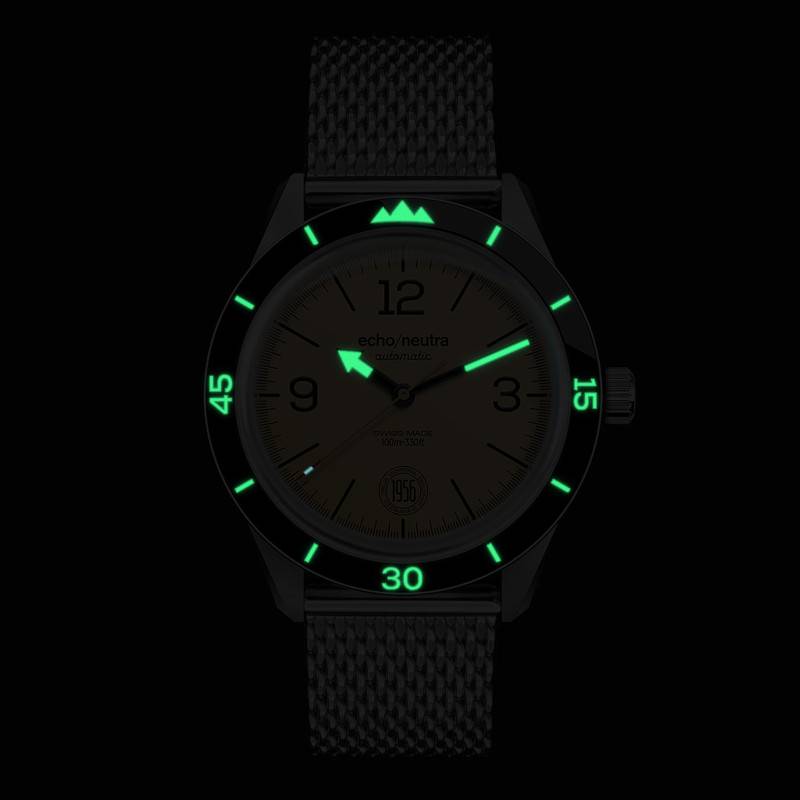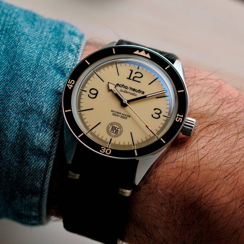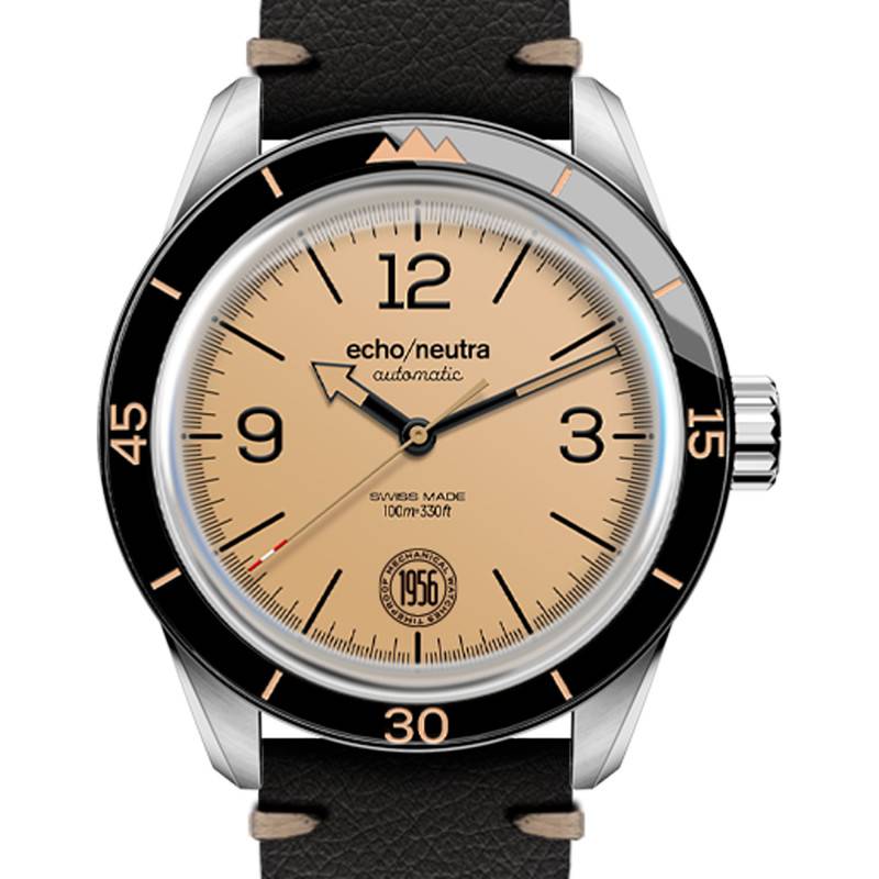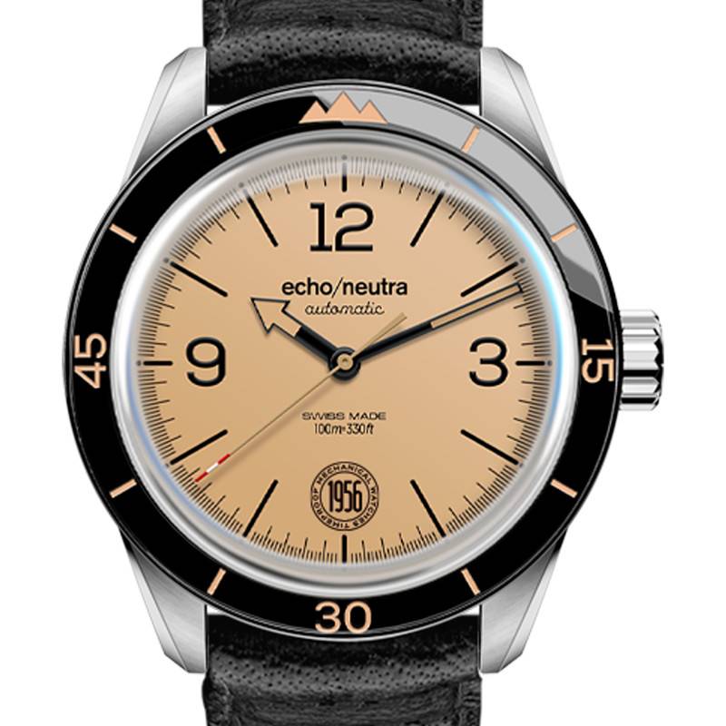 Les trois aiguilles du cadran vous offrent une couleur beige. Les aiguilles des heures et des minutes tranchent sur le cadran avec un contour noir, tandis que la trotteuse est terminée par une pointe rouge. L'aiguille des heures est en forme de flèche, tandis que l'aiguille des minutes propose une forme bâton. Le cadran possède un chemin de fer des minutes gradué noir, en adéquation avec les index bâtons et les trois index en chiffres arabes 3, 9 et 12, avec les 6 heures qui sont remplacées par le logo "1956" de la marque. Avec sa couleur beige vintage, le cadran s'accorde avec les inscriptions figurant sur la lunette fixe, aux tons noirs. Le bouton remontoir est vissé à 3h, tandis que la mention "echo/neutra" est apposée à midi. Les aiguilles sont luminescentes, parfaites pour une vision claire dans l'obscurité.