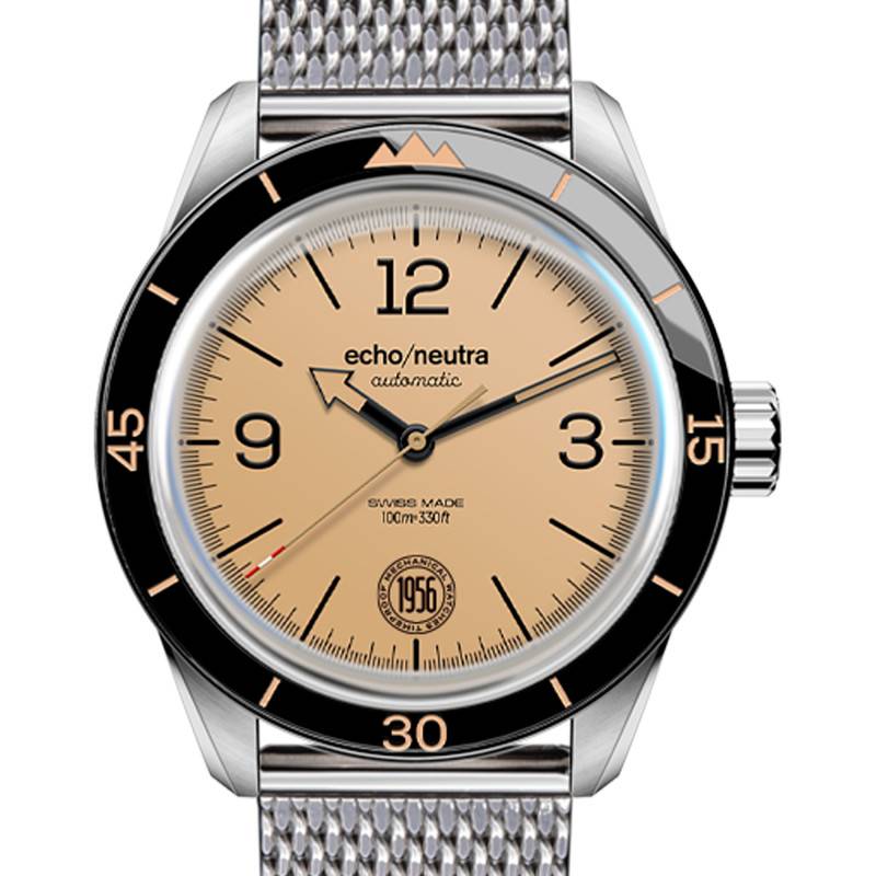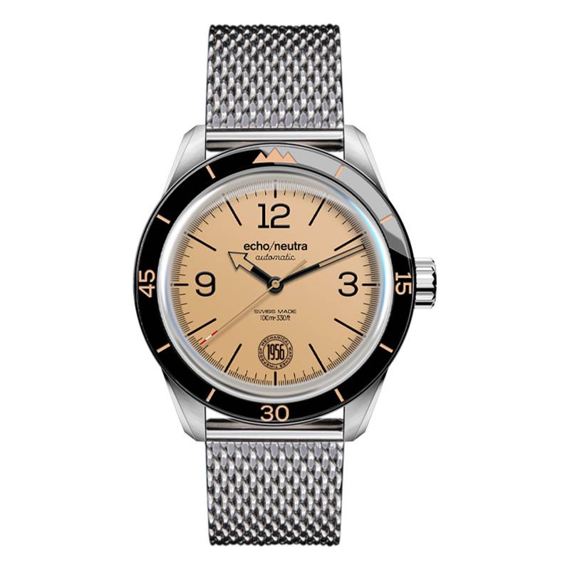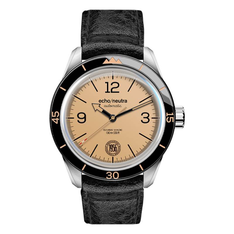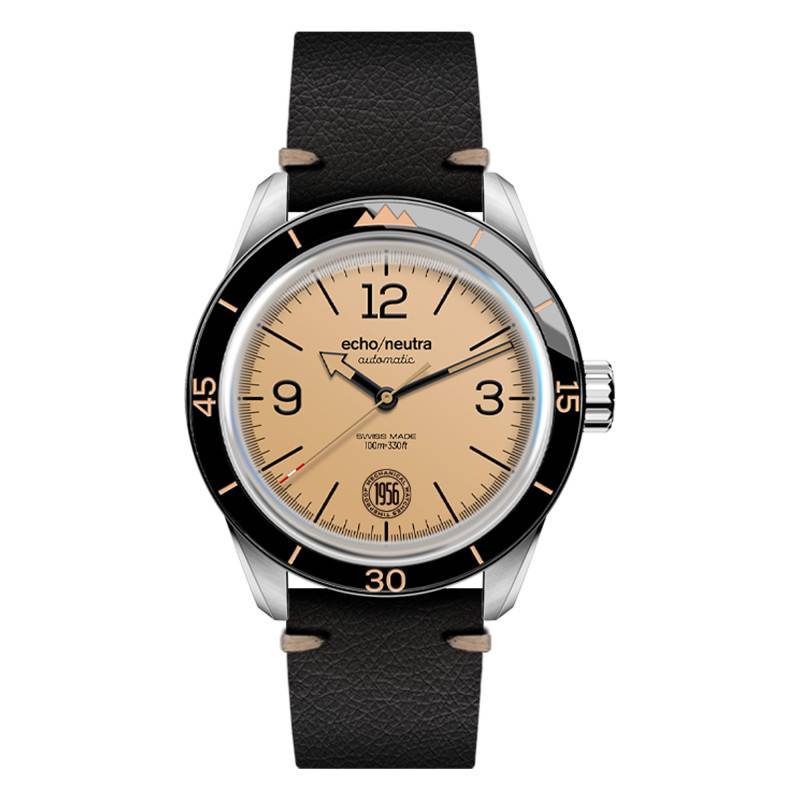Echo/Neutra vous présente son modèle 1956 3H dispose d'un boîtier rond en acier inoxydable de 40mm de diamètre pour 11,9 mm d'épaisseur. La marque a équipé la montre d'un verre saphir, l'un des matériaux les plus solides au monde, pratique pour ne pas rayer son précieux. La montre est dotée d'un fond de boîte vissé à l'arrière du cadran. La lunette fixe noire est en concordance avec le beige du cadran, rajoutant cet aspect vintage au design de la montre. Étanche à 100m, ce garde-temps vous accompagnera dans toutes vos activités.