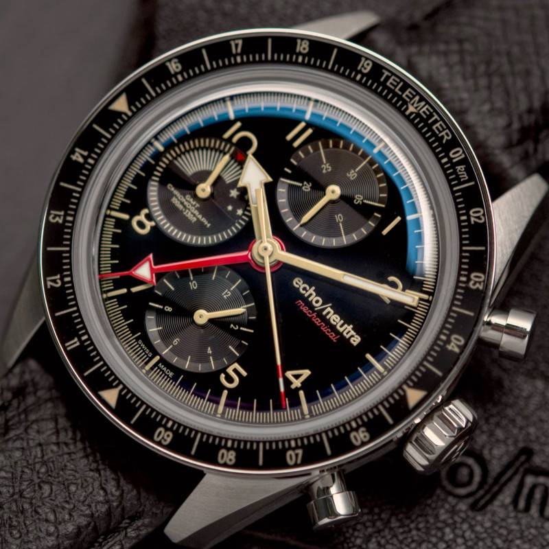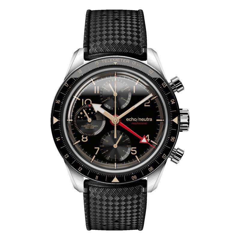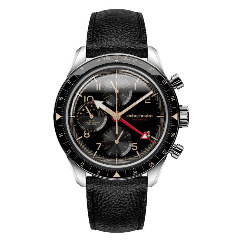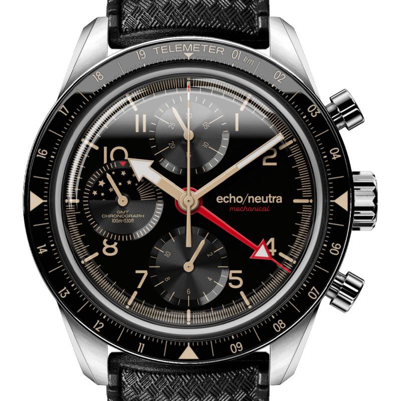 Echo/Neura est une marque italienne conceptuelle de construction suisse avec un design original et un esprit sportif vintage. Attentive aux moindres détails, elle est née du partenariat entre Nicola Callego et Cristiano Quaglia. Cette marque horlogère propose des garde-temps aux styles de caractères forts, définis et sans compromis, car pour elle, l'important n'est pas de plaire à tout le monde, mais de réussir à séduire ceux qui épousent son style. Elle combine savoir-faire et technicité, fabrication et design ou encore utilité et émotion dans le but de vous proposer des garde-temps parfaitement élégants et indispensables. Ses modèles sont parfaitement équipés de mécanismes de pointe et sont fabriqués à partir de matériaux robustes pour un usage durable. Aujourd'hui, elle a le plaisir de vous présenter sa nouvelle montre 1956 Chrono GMT Noir qui vous offrira des performances exceptionnelles.Son boîtier est réalisé en acier inoxydable 316L satiné et poli, ce qui lui confère cette allure incroyable. Argenté, ce dernier prend une forme ronde de 40 mm de diamètre avec une épaisseur de 14,80 mm en tenant compte du verre. De type saphir, celui-ci est ultra-bombé et protège le cadran des chocs éventuels. De plus, il est pourvu d'un double traitement antireflet assurant une lisibilité sans contrainte en toute condition. Il est entouré par une lunette munie d'un insert en céramique et d'une échelle télémétrique qui sont pourvus d'un Superluminova Old Radium assurant une lisibilité optimale dans l'obscurité. Vers la droite, est placée une couronne grise et crantée assurant une bonne prise en main. Cette dernière est accompagnée de deux boutons-poussoir de la même teinte et, ensemble, ils manipulent les différents éléments centraux. Le tout se ferme par un fond de boîte vissé et gravé assurant une étanchéité de 10 ATM.