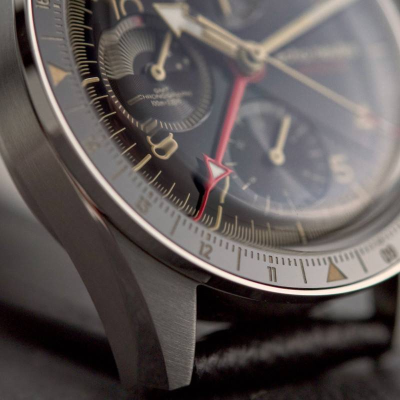 Ce cadran à l'aspect original apporte un style captivant à ce modèle. De forme ronde, il arbore un fond noir qui dévoile un pourtour affichant le chemin de fer des minutes avec des index bâtons. Ces derniers sont complétés par des chiffres arabes et désignent les heures. Ensemble, ces différents marqueurs sont survolés par les trois aiguilles beiges fixées au centre. La plus fine au bout bicolore est une trotteuse qui totalisera les secondes du chronographe. Elle est suivie par une courte aiguille en forme de flèche qui vous indiquera les heures et d'une grande aiguille de type bâton indiquant les minutes. Une quatrième aiguille de couleur rouge les rejoint et désigne les heures de la fonction GMT. Vous noterez qu'ensemble, elles sont revêtues d'un traitement super-luminova BGW9 assurant une meilleure lisibilité en cas de faible luminosité. Ce revêtement se trouve également sur les indices des heures. Pour plus de fonctionnalités, trois compteurs additionnels sont placés à 6, 9 et 12 heures. Ces derniers vous communiqueront respectivement l'affichage 12 heures, les petites secondes en même temps que l'indication jour/nuit et les 30 minutes du chronographe. À 3 heures, la marque appose son nom et le type de mouvement en guise de signature.