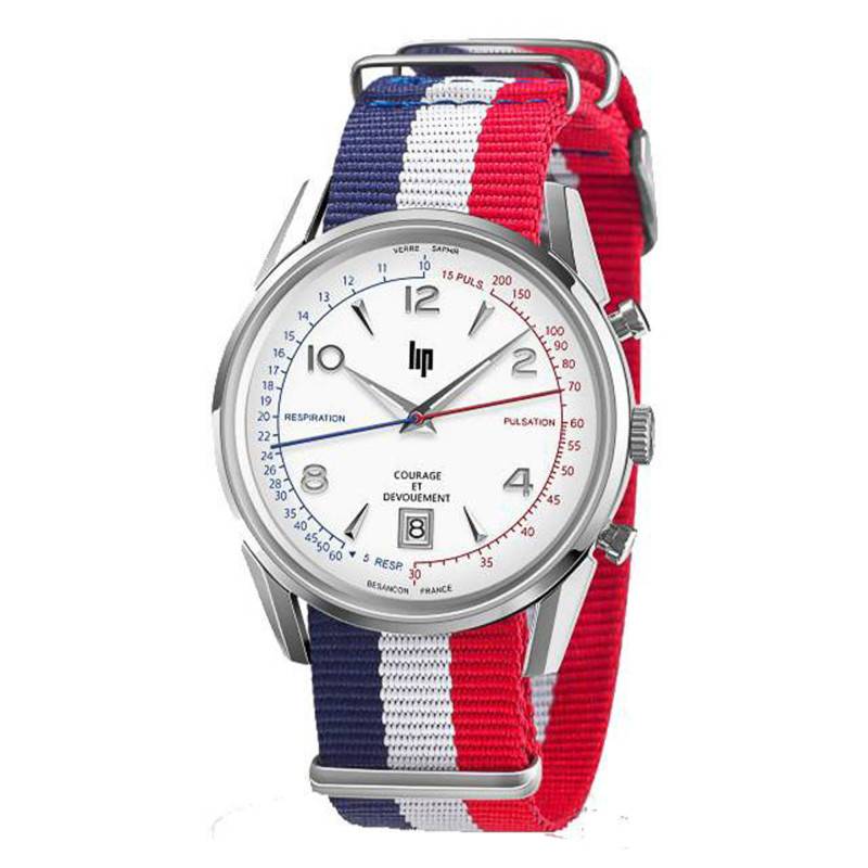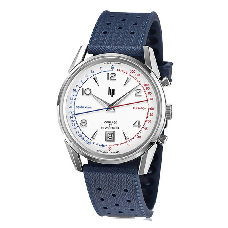 La célèbre marque française Lip, vous propose, en partenariat avec la Fédération Nationale des Sapeurs-Pompiers de France (FNSPF), un outil d'aide à la décision pour tous les métiers du secourisme : pompiers, médecins, infirmiers et secouristes bénévoles. Cette montre possède un boîtier rond en acier inoxydable 316 L. Il mesure 40 millimètres de diamètre, dimensions idéalement mixtes. Le boîtier est surmonté par un résistant verre saphir bombé. A sa droite, se positionnent une couronne remontoir, ainsi que deux boutons-poussoirs. Enfin, ce modèle aura une étanchéité de 10 atmosphères.