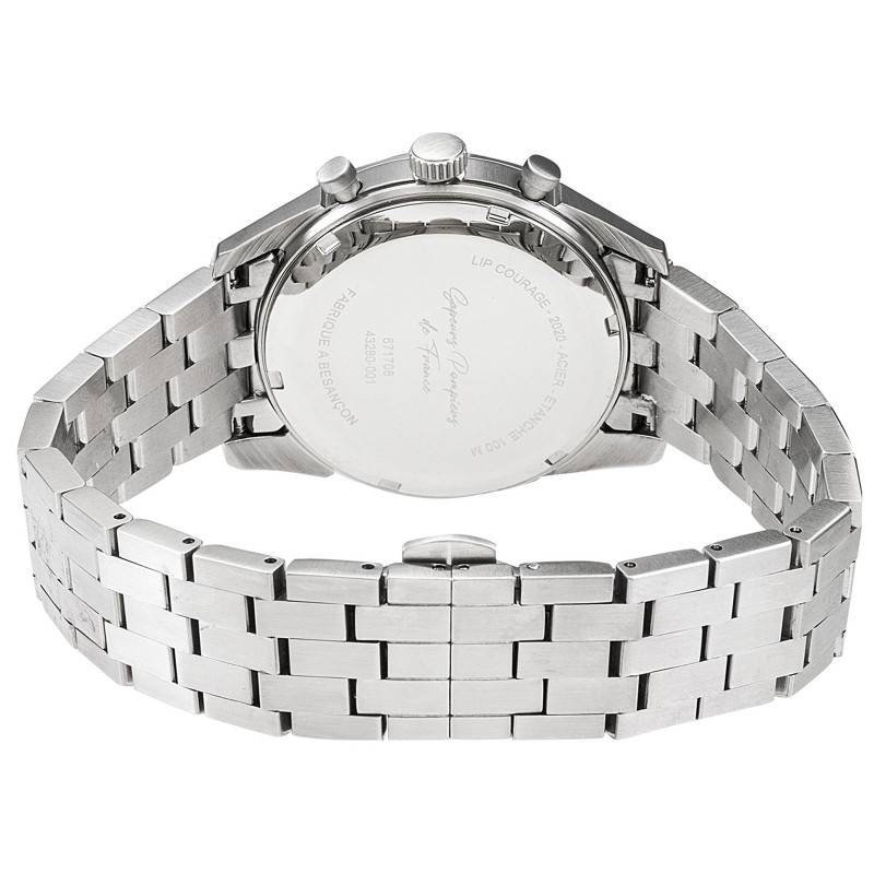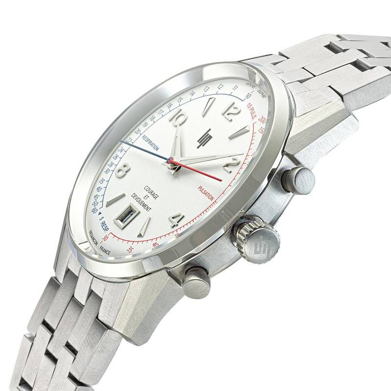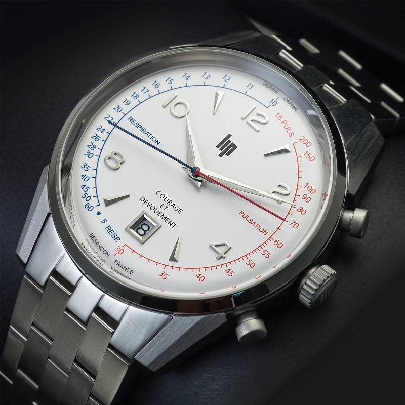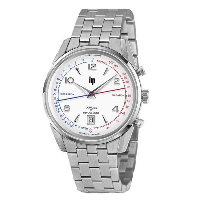 Fondée en 1867, LIP est une marque résolument ancrée dans le domaine de l'horlogerie française. Elle se distingue par ses innovations et ses créations exclusives ainsi que ses designs élégants et sophistiqués. La collection Courage a été développée par LIP, en partenariat avec la Fédération Nationale des Sapeurs-Pompiers de France (FNSPF), comme un outil d'aide à la décision pour tous les métiers du secourisme. Elle est représentée ici sous le modèle 671708 avec un boîtier rond de 40 mm de diamètre. Il est conçu en acier inoxydable avec une finition polie radieuse et brillante qui offre de belles nuances argentées selon l'angle de la lumière. À sa surface se place un verre saphir bombé qui protège efficacement le cadran contre les rayures et sur son côté droit, s'installent la couronne crantée et les deux boutons-poussoirs en pompe. Ces boutons assurent le réglage des heures, des minutes et de la date ainsi que celui des échelles cardiaque et respiratoire. Pour ce qui est du fond de boîte, il est vissé et permet une étanchéité de 10 ATM.