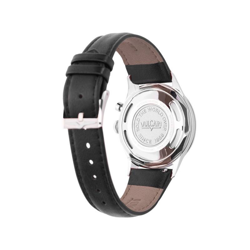 La maison Vulcain s'est fait un nom dans son domaine d'activité par la qualité de ses montres conçues grâce à un savoir-faire inégalé. Afin de magnifier votre poignet, la marque vous présente cette création de référence 100168A05.BAL248 qui saura rendre accrocheur votre poignet. Elle se pare d'un boîtier en acier inoxydable 316L doté d'une finition polie et d'une couleur grise qui vous séduira. Mesurant 39 mm de diamètre et 12,80 mm d'épaisseur, il habillera avec confort un poignet comme le vôtre. Sa surface ronde est surmontée d'un verre saphir bombé qui protégera avec résistance le cadran contre les risques d'usure et de chocs inévitables pouvant nuire à son esthétique. Quant au fond de boîte, il vous sera possible de choisir entre un fond plein ou un fond en verre saphir laissant apercevoir le mouvement. Ils garantiront tous les deux une bonne étanchéité de 5 ATM. Enfin, aux positions 2 et 3 heures, vous remarquerez un bouton poussoir et une couronne pour le réglage des différentes fonctions.