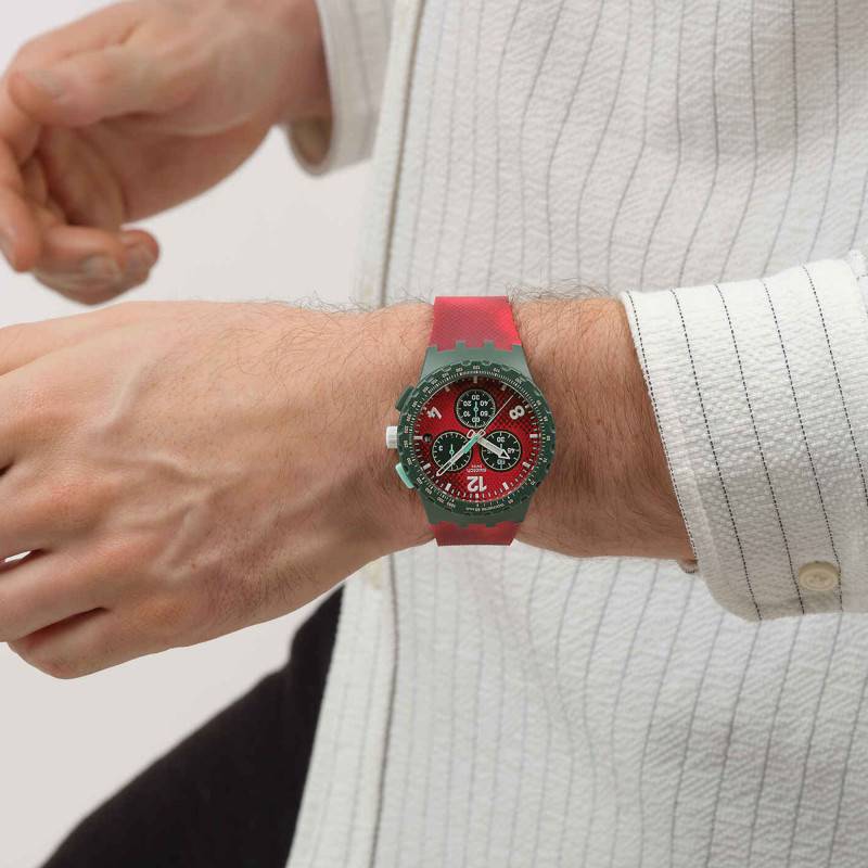 La montre Crimson Foliage par Swatch se distingue par son boîtier de 42mm en polymère de forme ronde et au design moderne. Ce matériau synthétique, connu pour sa légèreté et sa résistance, assure un confort inégalé au poignet tout en maintenant la robustesse de l'ensemble. Sa lunette est dotée d'une échelle tachymétrique, une caractéristique rare qui ajoute une dimension à la fois technique et esthétique à ce garde-temps. Ce design bicolore rouge et vert affiche une parfaite harmonie entre style et fonctionnalité, idéal pour l'homme moderne qui souhaite allier performance et esthétique dans un accessoire de tous les jours.