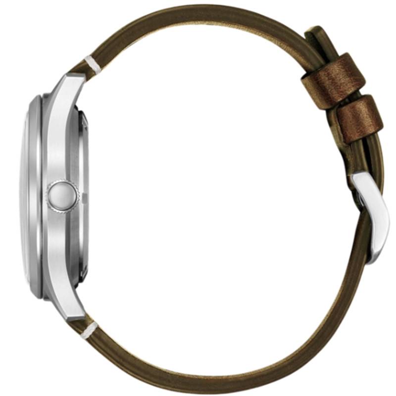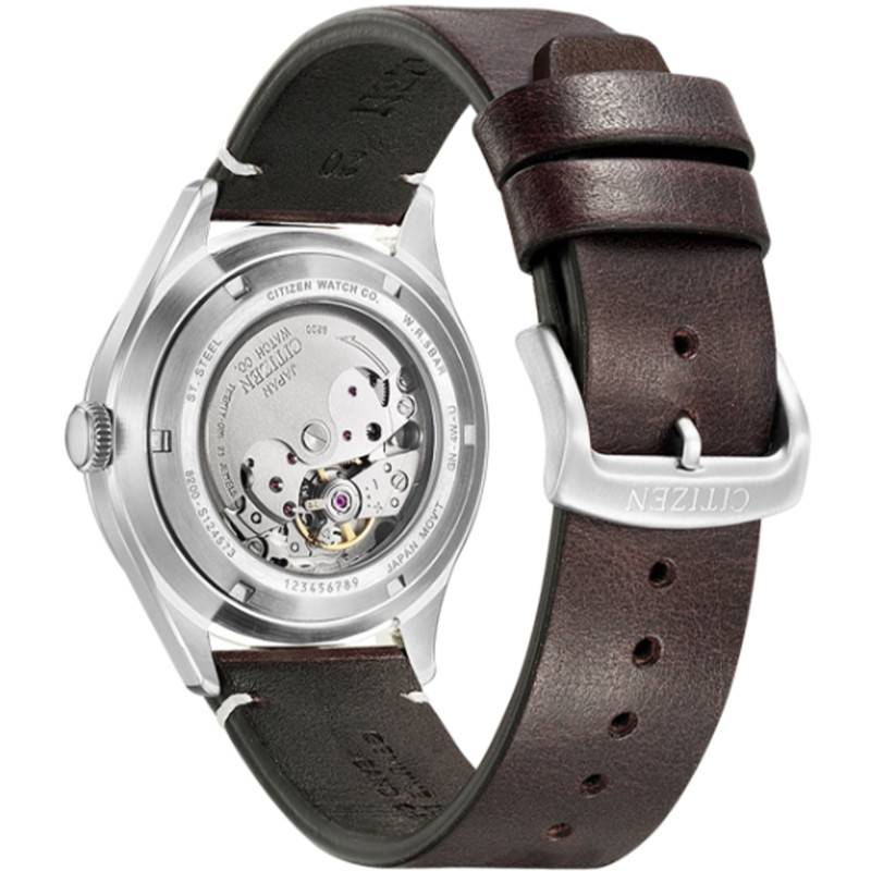 De bonne taille, le cadran de cette Citizen est surplombé sur le pourtour d'un discret chemin de fer des minutes blanc, et d'index bâtons en pointes argentés, dont la forme vient s'élargir lorsqu'il s'agit de vous signifier les 12h, les 3h, les 6h et les 9h. Au centre, vous retrouverez des aiguilles au nombre de trois : la plus petite pour les heures, celle de taille moyenne pour les minutes, et enfin, la plus fine, les secondes, que l'on appelle aussi "trotteuse". Les deux aiguilles les plus imposantes, disposent d'une finition luminescente, qui vous permettra de lire l'heure facilement, même une fois la nuit tombée ! Sans omettre son double guichet, avec le jour à 12h et la date à 3h. Enfin, le nom de la marque repose à 12h et la mention "automatic" à 6h.