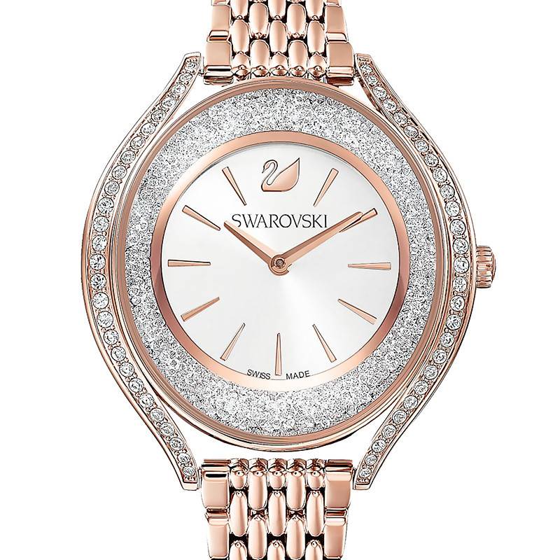 Swarovski vous présente le magnifique modèle issu de la collection Chrystalline Aura. Cette montre sublimera le poignet des femmes avec éclat grâce à ses 1300 cristaux qui ornent le boîtier. En effet, ce dernier de forme ovale est vêtu d'acier inoxydable avec un revêtement en PVD rose. Il affiche également un diamètre de 35,5 millimètres qui s'ajustera avec finesse sur les poignets féminins. De plus, une sublime lunette agrémentée de cristaux viendra s'ajouter sur le pourtour du boîtier et offrira de la brillance à la montre. Vous noterez que le cadran sera surplombé d'un verre minéral qui le protégera des rayures et des chocs. D'autre part, afin de régler les heures et les minutes, une couronne fera son apparition à trois heures. Enfin, le fond de boîte assurera une étanchéité de 5 ATM.