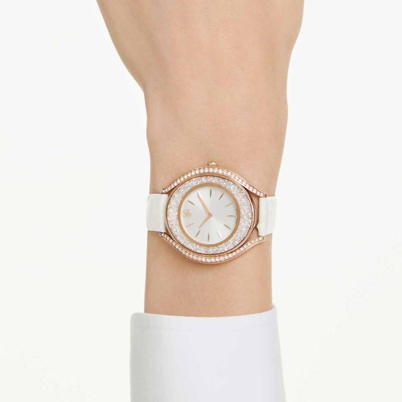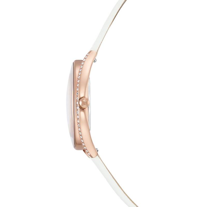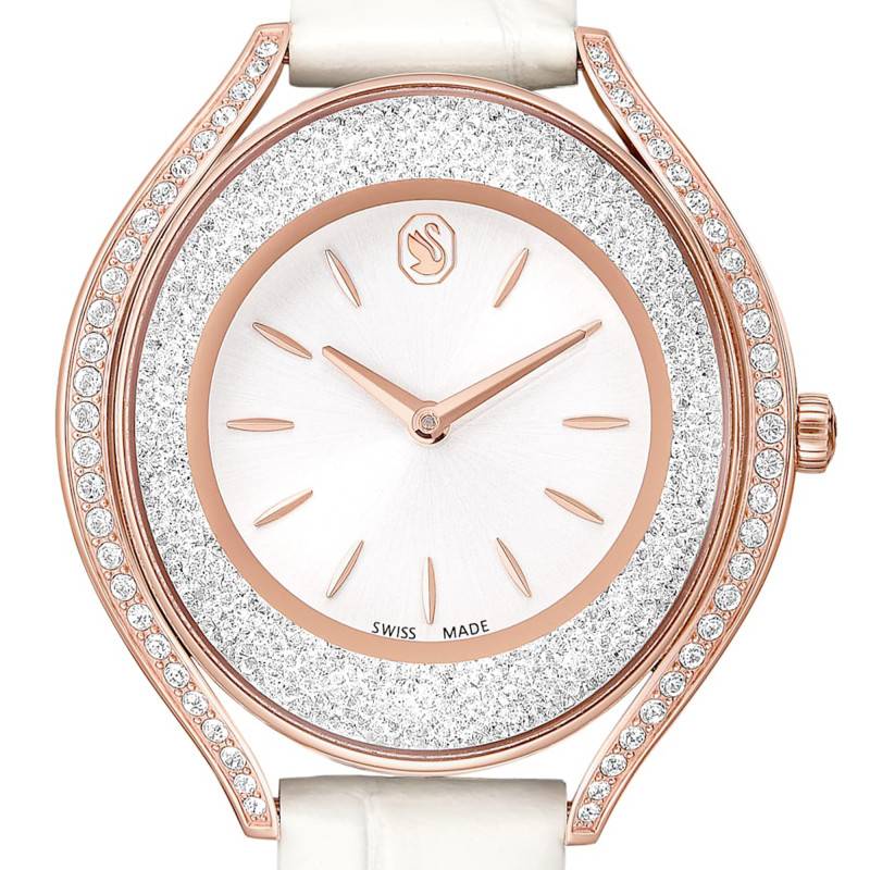 La montre Crystalline Aura de Swarovski incarne une élégance moderne grâce à son boîtier en acier inoxydable PVD rose. Avec ses dimensions de 40 mm par 35 mm et une épaisseur de 9 mm, elle s'inscrit parfaitement dans les standards contemporains de la mode féminine. Sa forme ovale unique attire le regard et s'accorde avec la féminité de son design. L'éclat des cristaux Swarovski sertissant la lunette ajoute une allure luxueuse, métamorphosant chaque geste en un moment d'éclat.