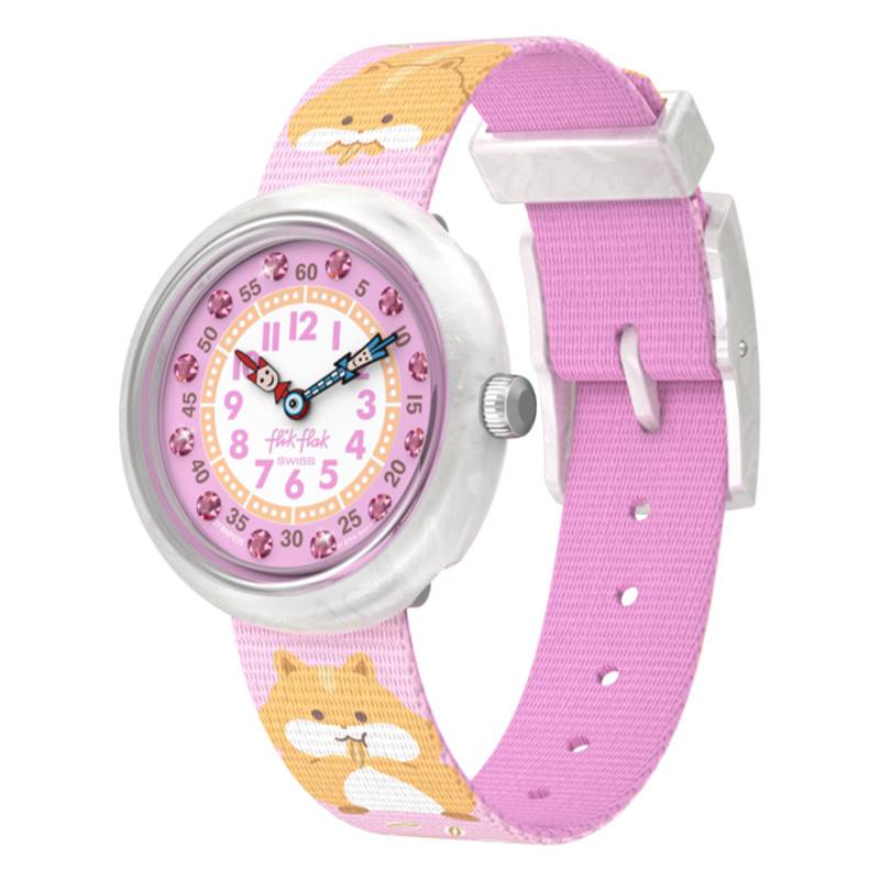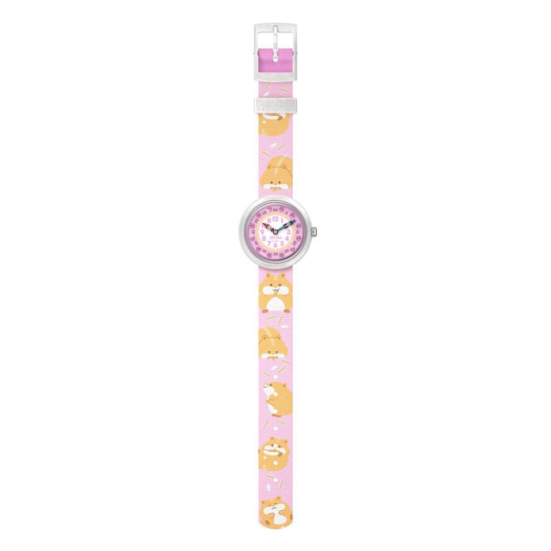 Le bracelet en PET de cette montre est un festival de couleurs et de motifs, habillé de teintes rose et orange qui évoquent la joie et le dynamisme. Les motifs de hamster imprimés ajoutent une touche amusante, ravissant les enfants et capturant leur imagination. Conçu pour être confortable, ce bracelet s'adapte parfaitement au poignet des enfants, grâce à son matériau doux et résistant. La boucle ardillon grise assure une fermeture sécurisée et simple, que les enfants peuvent utiliser eux-mêmes avec aisance.