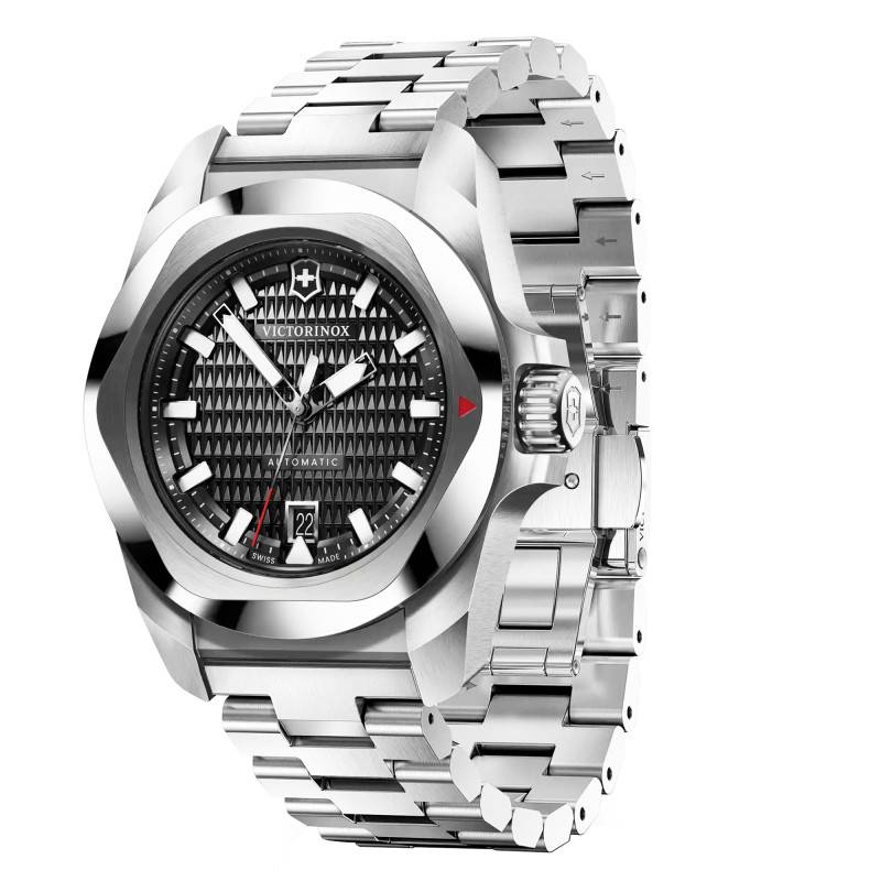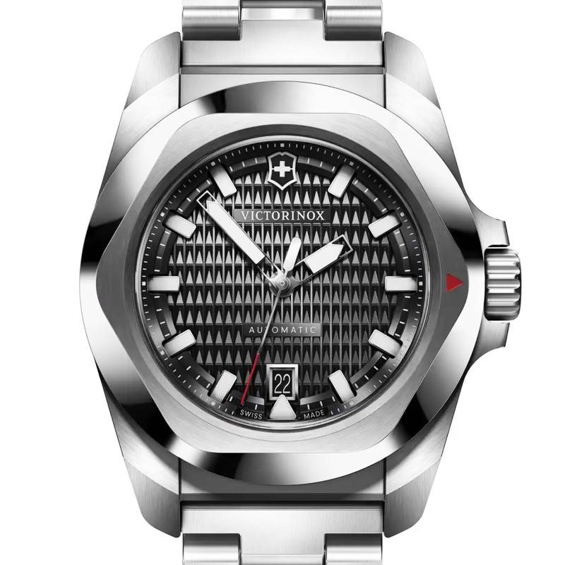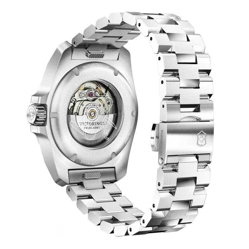 Au cœur de la Victorinox I.N.O.X. Automatic Steel, bat un mouvement automatique Sellita SW 200-1 suisse, reconnu pour sa précision et sa fiabilité. Ce calibre, oscillant à une fréquence de 28.800 A/h (4 Hz), offre une performance horlogère impeccable qui hante les passionnés les plus exigeants. Sa conception mécanique se retrouve accentuée par le fond transparent, exposant ainsi la masse oscillante et les rouages savamment agencés sous le boîtier. Ce calibre offre aux utilisateurs les fonctions essentielles que sont les heures, minutes, secondes, et dispose d'un affichage de date sobre et pratique, renforçant l'aspect intemporel de ce garde-temps.