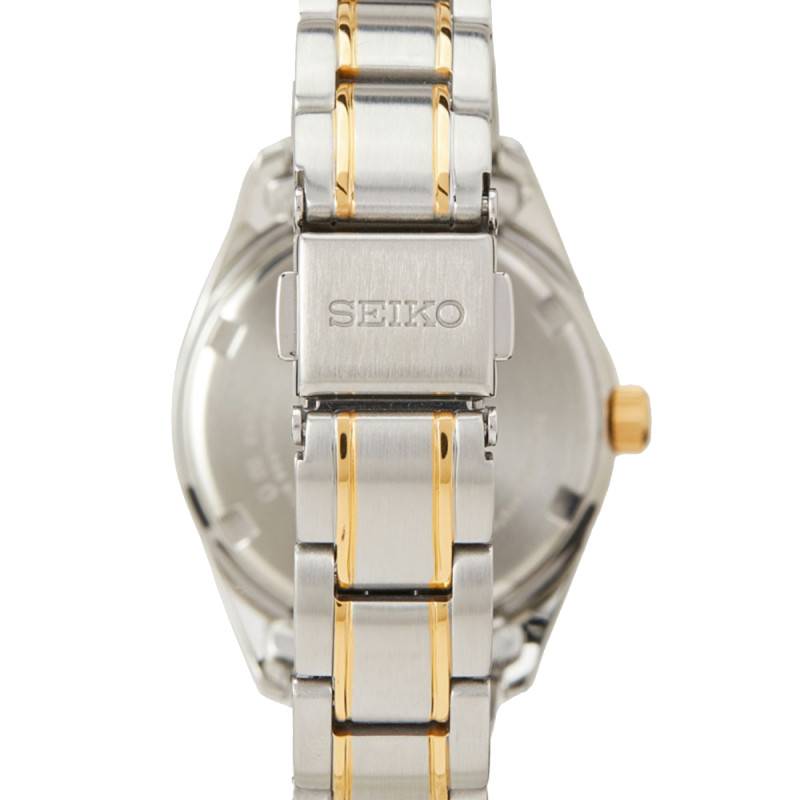 La maison horlogère Seiko vous propose de découvrir ce charmant garde-temps pour femme au style épuré et élégant. Ravisant mélange entre l'argent et l'or, ce modèle vous séduira de par la finesse de ses lignes et son design traditionnel. Elle se dote d'un boîtier en acier inoxydable de 29 millimètres, idéal sur un poignet féminin. Afin de protéger parfaitement votre boîtier, ce dernier s'équipe d'un verre Saphir ultra-résistant afin d'échapper aux rayures et aux malencontreux chocs du quotidien. Il se voit surplombé par une lunette fixe dorée apportant plus d'éclat au cadran. C'est au niveau de l'index de trois heures que vous trouverez une fine couronne crantée dorée située à trois heures afin de faciliter le réglage des aiguilles et du guichet date. Enfin, son fond de boîte emboîté vous garantira une étanchéité de 5 atmosphères.