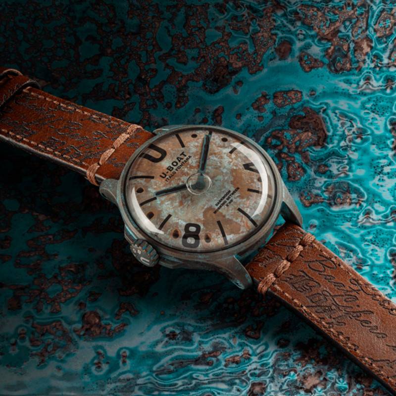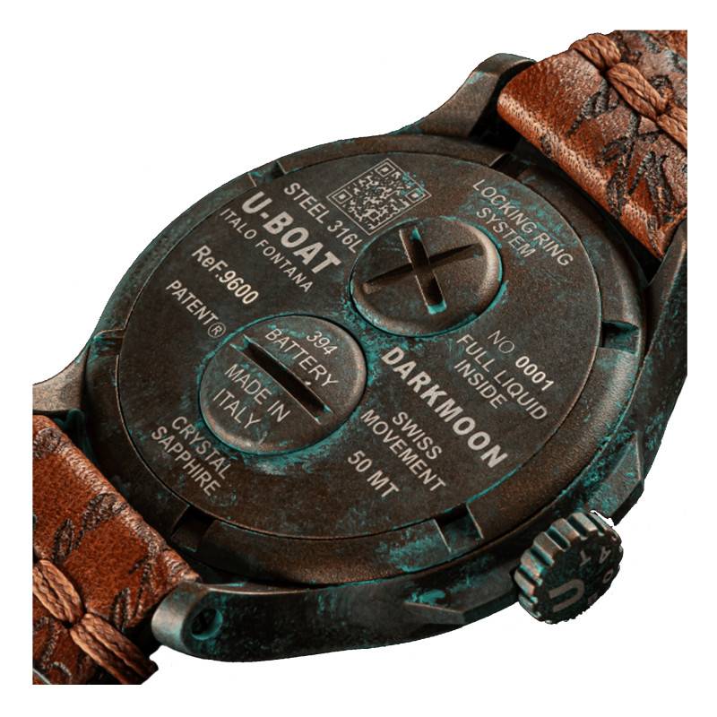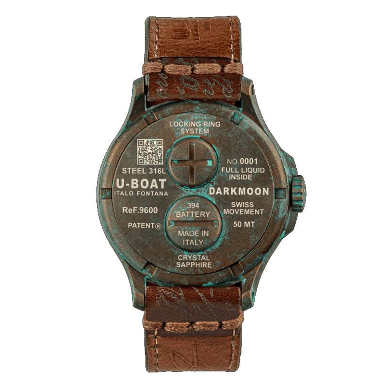 Mettant en avant une vision “audacieuse et excentrique” de l'horlogerie, la marque incontournable U-Boat ne cesse de véhiculer le “Made in Toscane” à travers des créations authentiques et racées de très haute qualité. Chacun de ses garde-temps mêle une ingéniosité technique, une esthétique prononcée et un ADN unique, permettant à ceux le portant de se démarquer avec prestance. De sa collection Darkmoon, U-Boat vous présente cette éblouissante montre Unico 9600 aussi stylisée que précise. Unique par son nom, par son identité et par son élégance, celle-ci témoigne d'une qualité artisanale exceptionnelle et d'un savoir-faire ancestral, faisant le grand plaisir de toute personne en quête d'un modèle techniquement et esthétiquement élaboré. Cette édition numérotée sera l'addition raffinée et intemporelle qui rehaussera toutes vos tenues. Elle est agencée avec un délicat boîtier rond qui est conçu en acier inoxydable AISI 316L avec un revêtement IP bronze qui lui accorde cette belle couleur. Pour lui donner un aspect plus singulier, un traitement manuel spécial utilisant divers acides superposés a été appliqué sur toute sa surface pour un rendu oxydé et vieilli qui fait toute la distinction de ce modèle. Mesurant 44 mm de diamètre, ce boîtier est rempli d'une huile spéciale qui accorde au cadran un effet illusionniste accrocheur en mettant en exergue sa singularité. Contrairement à la tradition horlogère, une couronne vissée au design cranté est protégée à 9h. À l'aide de celle-ci, vous pourrez régler à tout moment les heures et les minutes. Par ailleurs, un verre saphir bombé de haute qualité vient passer par-dessus le cadran le protégeant contre les éventuels chocs et rayures pouvant l'endommager. Résistante aux variations de température entre 0°/+60°C, cette montre dispose d'un fond de boîte vissé qui lui assure une étanchéité de 5 ATM. Pourvu d'un système de verrouillage innovant, ce dernier est équipé d'une trappe à pile pour un changement rapide. Il est numéroté et est gravé au laser par un code QR que vous pourrez scanner pour avoir accès à une expérience numérique exclusive.