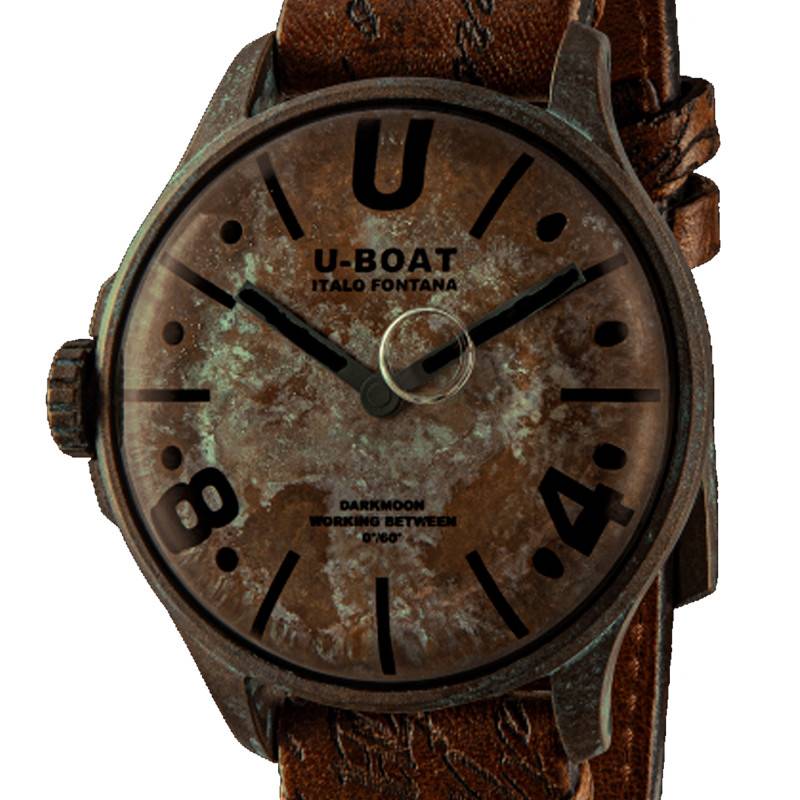 Le boîtier présente un charmant cadran rond qui souligne l'originalité de ce garde-temps en lui conférant un aspect racé et élégant. Il offre une lecture temporelle fluide et nette en créant un effet tridimensionnel distingué. Sa forme bombée met en valeur son design épuré et sa couleur marron. Ce cadran se pare d'un fond en métal arborant huit trous et peint avec une finition vieillie pour un résultat unique, faisant toute la singularité de ce modèle. Il est survolé par deux aiguilles bâtons qui vous indiqueront les heures et les minutes avec une grande précision. Celles-ci sont faites également en métal et sont peintes avec une couche de SuperLuminova noire. Ce traitement luminescent permet une bonne visibilité du temps dans des milieux obscurs. Les heures sont repérables par des index noirs présentés par des bâtons avec des chiffres arabes. L'index de 12h est marqué par le “U” d'U-Boat, complétant le design de ce modèle par une touche sophistiquée. La bulle d'air visible sur le cadran permet de compenser les variations de température. Pour finir, le nom de la marque est apposé sous midi avec le nom de son fondateur “Italo Fontana”, tandis qu'à 6h est noté le nom de la collection “Darkmoon”.