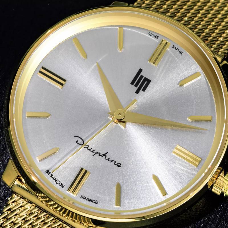 La cadran gris perle accueille trois aiguilles dauphines en acier inoxydable recouvert d'un traitement PVD or jaune. Elles parcourent un cadran dépourvu de chemin de fer des minutes.. De plus, les index de 3 heures, 6 heures, 9 heures et 12 heures sont doublés alors que les autres se terminent par une pointe. Sous l'index de 12h se trouve le nom de ma marque "Lip" alors que le nom de la collection "Dauphine" se lit au dessus de l'index 6 heures en lettres cursives noires. Enfin, le lieu de fabrication est indiqué autours de l'index de 6 heures. Vous êtes en présence d'un cadran simple et épuré.