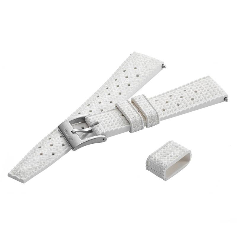Cette montre est proposée avec quatre versions distinctes de bracelets, chacun apportant sa propre touche de style et de confort. Les options incluent un bracelet en caoutchouc blanc, idéal pour les environnements marins grâce à sa résistance à l'eau et au sel, ainsi qu'en caoutchouc noir pour une allure classique et polyvalente. Le bracelet en acier inoxydable 316L à 3 maillons propose une transition fluide entre sport et élégance, tandis que le bracelet en acier type grain de riz se distingue par son raffinement intemporel et son grand confort au poignet, grâce à ses maillons souples et articulés qui épousent parfaitement la forme du bras.