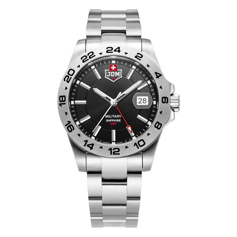 JDM Military est une sous-marque de la maison incontournable Jacques du Manoir. À l'esprit suisse fortement créatif et innovant, elle propose à tous les passionnés de l'horlogerie des montres 100% Swiss Made arborant des designs sportifs et uniques et présentant une performance éprouvée et une finition épurée. La marque présente aujourd'hui à travers sa collection Delta 24 ce merveilleux garde-temps JDM-WG018-02 qui vous sublimera une fois porté. Arborant un design épuré conjugué à un style urbain et une performance technique, il sera l'addition moderne et élégante qui rehaussera le charme de vos tenues de jour comme de nuit en vous assistant avec grande fiabilité durant toutes vos aventures. Vous pourrez le porter au quotidien, il se prêtera à toutes les occasions en perdurant dans le temps. Il se pare d'un boîtier de forme ronde qui mesure 45 mm de diamètre, un choix parfait pour convenir à toutes les tailles des poignets masculins. Agréable et confortable à porter, ce dernier est fabriqué en acier inoxydable avec une finition polie qui rehausse son charme. Il loge à sa droite une couronne au design cranté qui se positionne à 3h. Celle-ci vous permettra de régler au gré de vos envies les heures, les minutes et la date. Le cadran restera intact face aux chocs et aux éraflures issus de l'usage quotidien, et ce, grâce au verre saphir qui le surplombe. Une lunette GMT encercle ce dernier, dévoilant des graduations d'heures en chiffres arabes et en forme triangulaire. Au verso, le fond de boîte est vissé, ce qui permettra une étanchéité de 10 ATM.