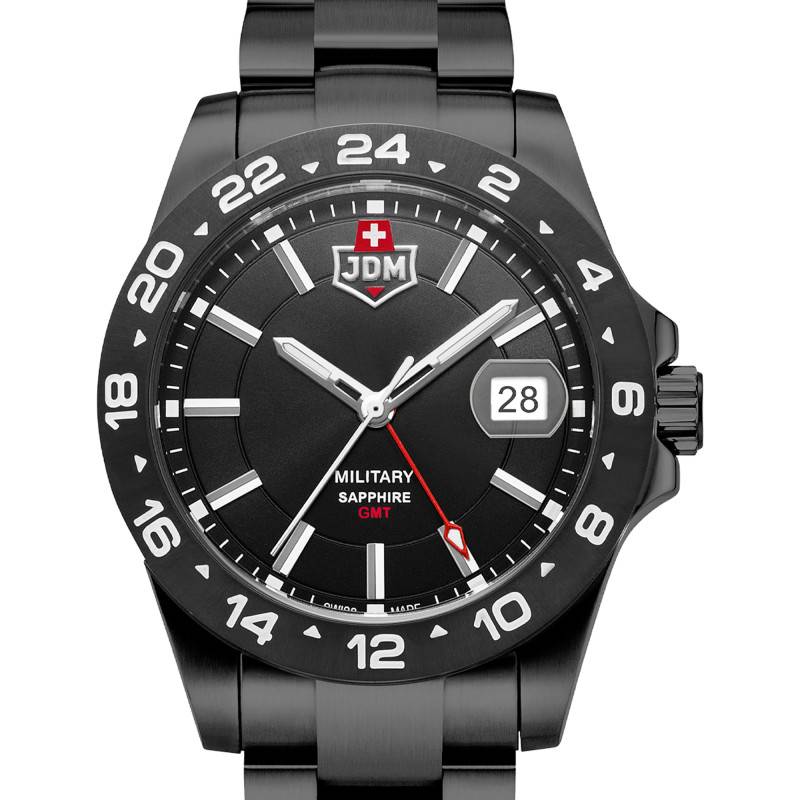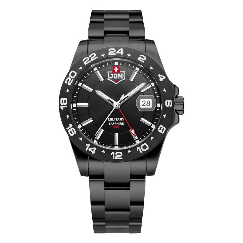 Le cadran rond de cette montre arbore un fond noir pour s'accorder parfaitement avec le bracelet et le boîtier, offrant un effet saisissant. Ce dernier se pare d'une finition semi-brillante et de marqueurs temporels gris, ce qui assurera une lecture de temps nette et claire. Une fine trotteuse de couleur blanche commence la course, indiquant les secondes. Elle est suivie par deux aiguilles ajourées de couleur grise qui sont pourvues d'un revêtement luminescent pour vous communiquer les heures et les minutes dans des milieux aussi bien éclairés que sombres. Ce traitement est appliqué également sur des rectangles placés par tranches de cinq minutes sur le pourtour marqué “Swiss Made”. Celui-ci est gradué par des traits blancs formant un chemin de fer des minutes. Les heures sont présentées par des index bâtons à l'exception de 12h qui est marquée par le logo de la marque et de 3h à la position de laquelle est disposé un guichet date. Celui-ci est surplombé par une loupe cyclope et dévoile un fond blanc avec des chiffres arabes noirs. Par ailleurs, vous remarquerez la présence d'une quatrième aiguille de couleur rouge et à la pointe luminescente. Elle sert à l'indication de l'heure GMT. Vers 6h, sont notées les mentions “Military”, “Sapphir” et “GMT”.