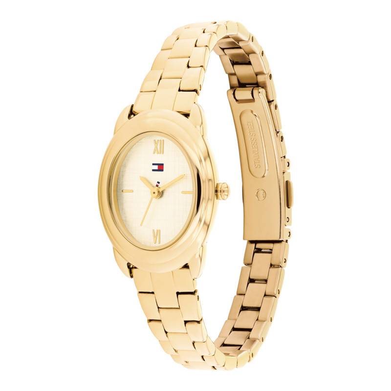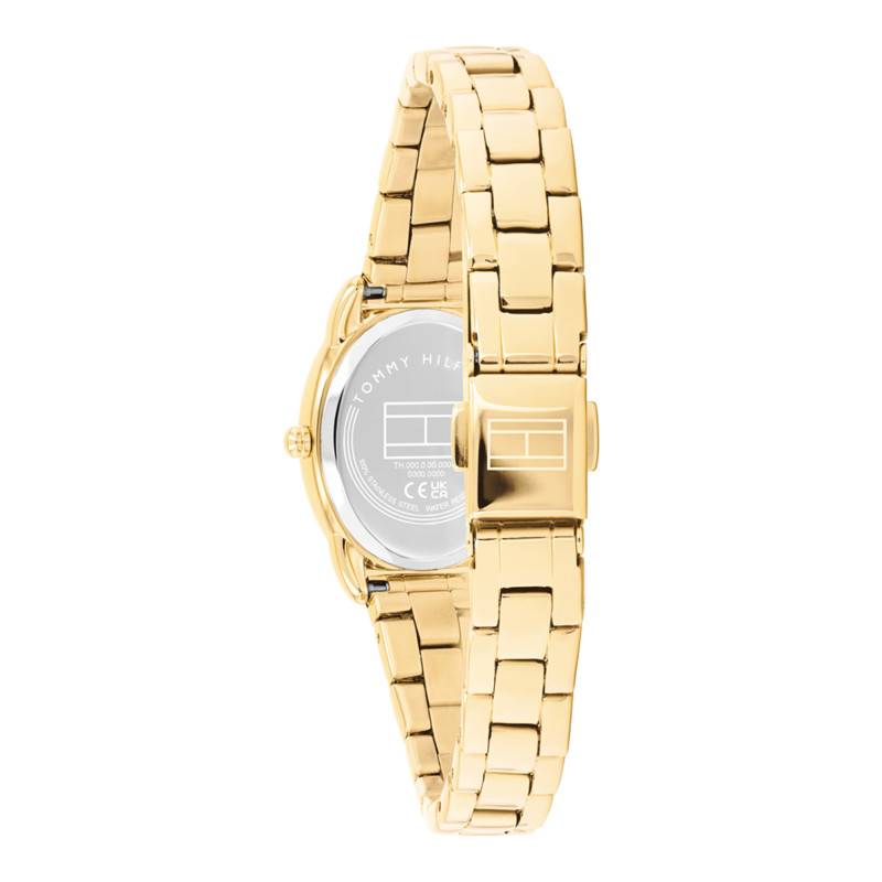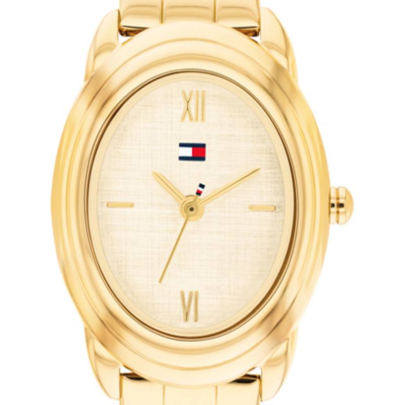 La montre Tommy Hilfiger Demi se distingue par son design chic et contemporain, parfait pour sublimer le poignet de chaque femme. Conçue en acier inoxydable, sa couleur jaune rayonne de modernité tout en conférant une allure distinguée. Le boîtier ovale présente des dimensions très légères avec un diamètre de 22 mm et une épaisseur de 8 mm, pesant à peine 40 grammes. Le verre qui protège le cadran est en verre minéral plat, offrant une excellente résistance aux griffures tout en accentuant la beauté du garde-temps.
