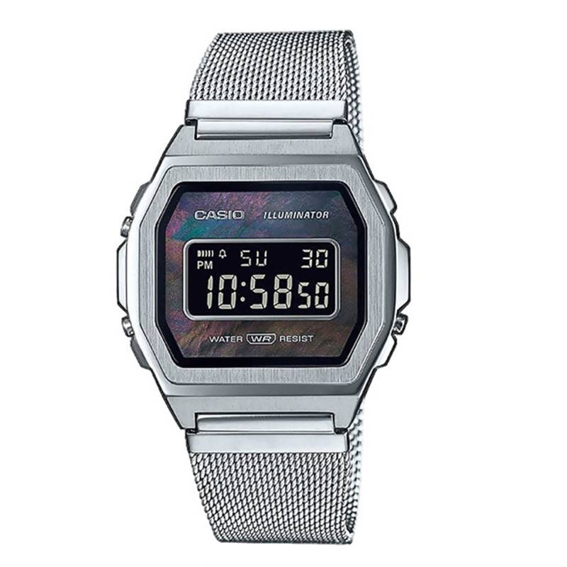 Cette montre A1000M-1BEF arbore un cadran digital de forme octogonale. Coloré et moderne, son style sportswear se retrouve au coeur de ce cadran multicolore. Vous retrouverez les heures, les minutes et les secondes ainsi que la date et le jour sur son affiche numérique de forme rectangulaire sur un fond de couleur noire. Ce dernier est entouré d'une couleur grise qui rappelle celle de son boîtier. Ce somptueux modèle Casio Vintage est assigné par la marque en haut et à gauche du cadran ainsi qu'en rappelant une fonction inédite, son option Illuminator.