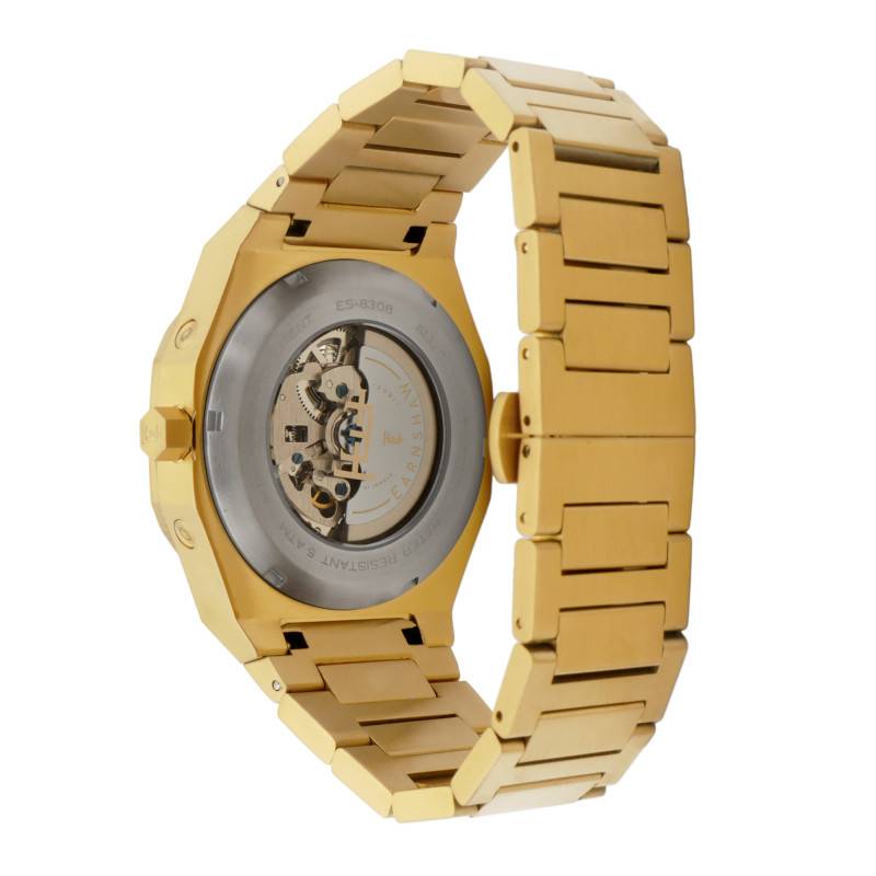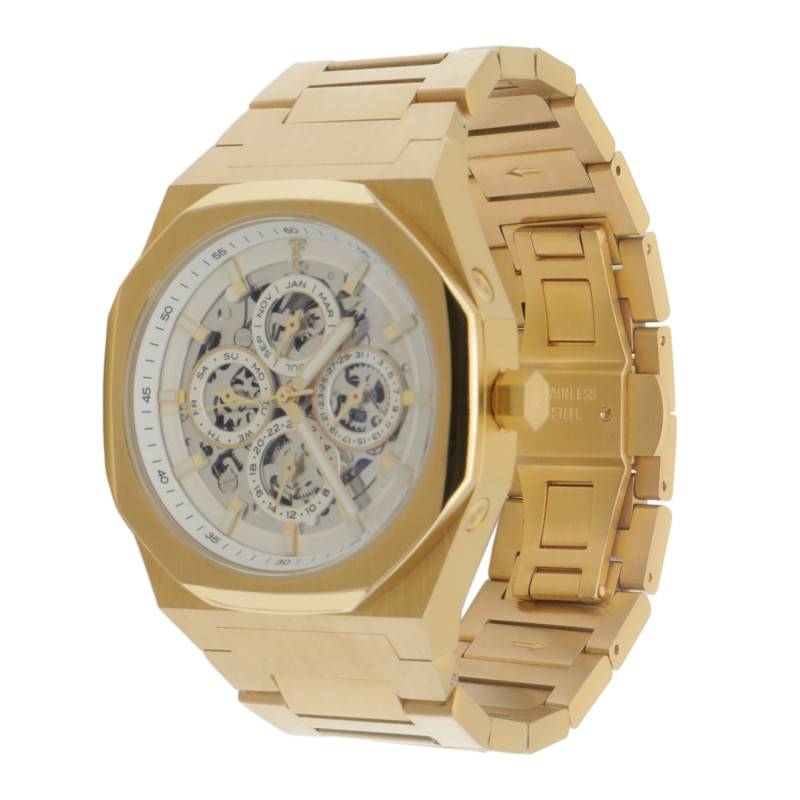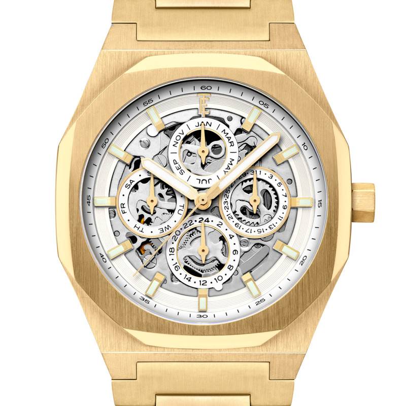 La montre Thomas Earnshaw Discovery Drake Triple Calendar Skeleton Automatic Cloudy Gold ES-8308-55 est un modèle qui se distingue par son style résolument moderne tout en restant fidèlement ancré dans les traditions horlogères classiques. Ce garde-temps, avec son boîtier octogonal de 42 mm de diamètre et une épaisseur de 13 mm, incarne l'équilibre parfait entre élégance et fonctionnalité. Fabriquée en Asie, cette montre s'inscrit dans une conception sophistiquée utilisant de l'acier inoxydable de première qualité, revêtu d'un somptueux PVD jaune qui capte la lumière de manière raffinée.