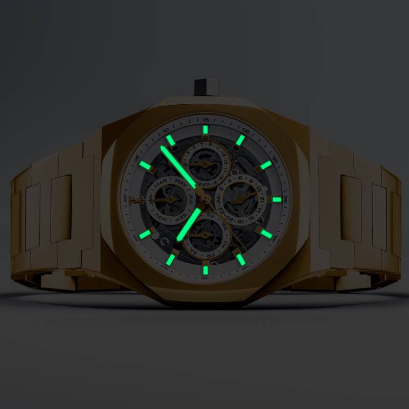 Le cadran de cette montre, véritable point focal de son esthétique magistrale, est orné d'une finition squelette qui révèle de manière spectaculaire le mécanisme intérieur en fonctionnement. Ce cadran exceptionnel attire le regard par sa couleur blanche, qui contraste élégamment avec le boîtier et le bracelet en jaune. Doté d'index et d'un chemin de fer des minutes, il assure une lisibilité parfaite tout en sublimant la beauté technique du mouvement. Ce design innovant est protégé par un verre minéral plat, prenant soin de réduire les reflets grâce à son traitement antireflets.
