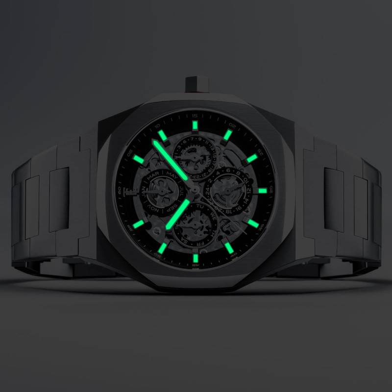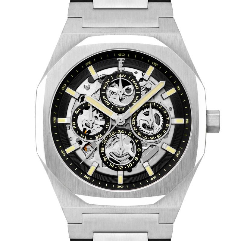 Le cadran squelette de cette montre offre un aperçu fascinant du mécanisme complexe qui se cache sous sa surface. Sa coloration en gris et noir, associée à un style de numération analogique avec des index, exprime une délicatesse rare. Quatre compteurs additionnels complètent ce cadran richement détaillé, chaque composant étant harmonieusement intégré pour former une symphonie visuelle de technologie et de style. Le verre minéral traité antireflets assure une clarté et une lisibilité optimales sous toutes les conditions d'éclairage.