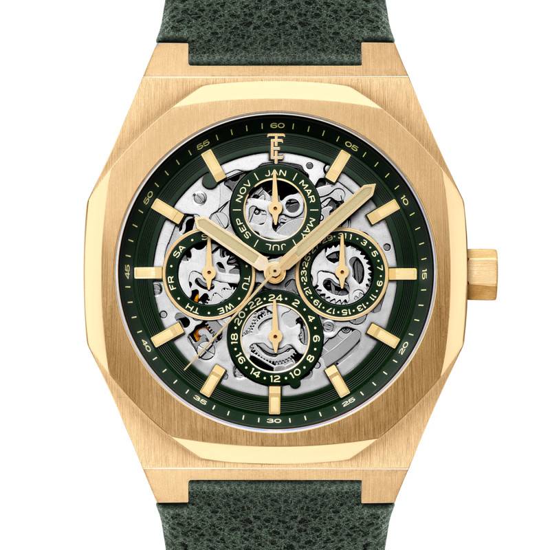 Le bracelet vert de cette montre, en cuir de bovin grainé, incarne une touche de luxe et de confort. Sa couleur verte unique rehausse la personnalité de la pièce, s'harmonisant parfaitement avec la finition jaune du boîtier pour créer un contraste visuel saisissant. La boucle ardillon ajoute une dimension de sécurité et de facilité d'utilisation, tout en complétant l'allure classique du bracelet.