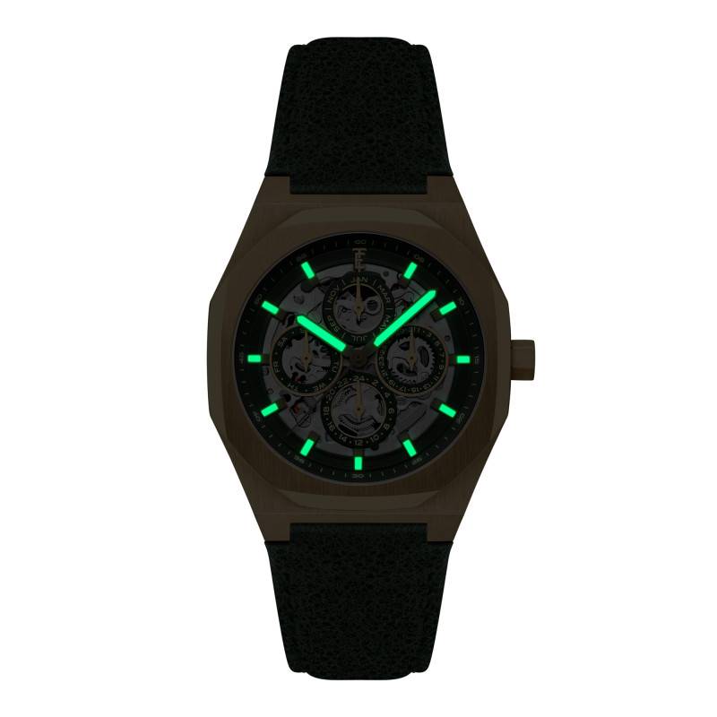 Le cadran est un véritable régal pour les yeux, incarnant la fusion parfaite entre esthétique moderne et tradition horlogère. Son design squelette révèle la complexité et la beauté du mécanisme interne, laissant entrevoir le mouvement délicat des rouages. Les index soigneusement placés permettent une lecture claire de l'heure, tandis que le chemin de fer des minutes encercle élégamment le cadran. Le verre minéral plat, doté d'un traitement antireflets, protège le cadran des éblouissements, assurant ainsi une lisibilité optimale dans toutes les conditions de lumière.