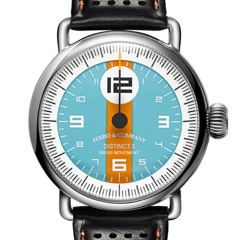 La marque Ferro & Company a a étée créée en 2014 par deux frères canadiens. Ayant pour volonté de commercialiser des modèles sportifs au look élégant, la marque vous présente la montre Distinct 3.0 GLF Quartz. Dotée d'un boîtier en acier inoxydable rond de 42 mm de diamètre pour 13.1 mm de diamètre, elle se pare d'un verre saphir bombé pour protéger son cadran. Protégeant le cadran des chocs et autres accidents du quotidien, ce dernier permet de porter votre montre sans vous soucier d'autre chose. Disposant d'une couronne remontoir crantée à trois heures, cette dernière permet le réglage de la montre. Dotée d'un fond de boîte vissé, ce modèle vous garantit une étanchéité de 100 mètres de profondeur, soit 10 atmosphères.