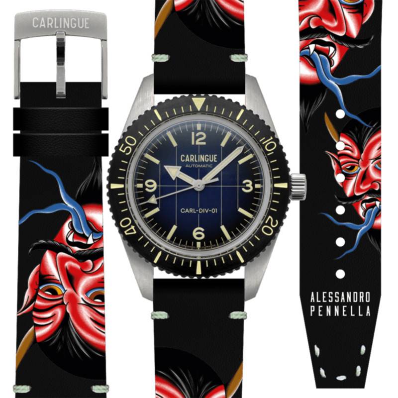 Le bracelet designé par Alessandro Pennella complète l'apparence de cette montre audacieuse avec un design en cuir recouvert de motifs représentant un diable, dans des tons rouges, bleus et noirs. Sa largeur d'entrecorne de 20,00 mm garantit une stabilité parfaite au poignet. Doté d'une boucle ardillon, ce bracelet allie sécurité et style, tout en assurant un ajustement confortable.